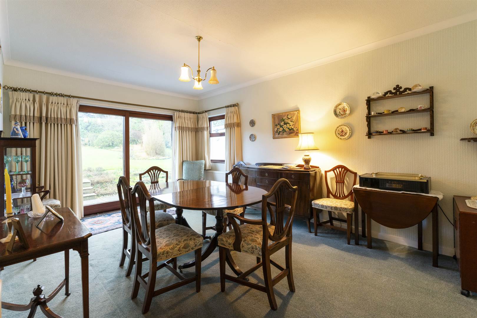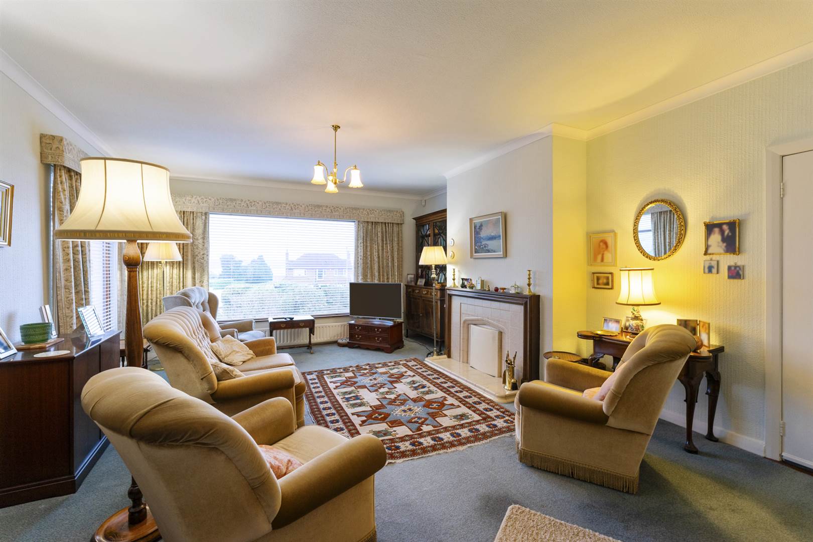 Tiled fireplace and hearth, hardwood surround, Lough views, coved ceiling, double sliding doors to: