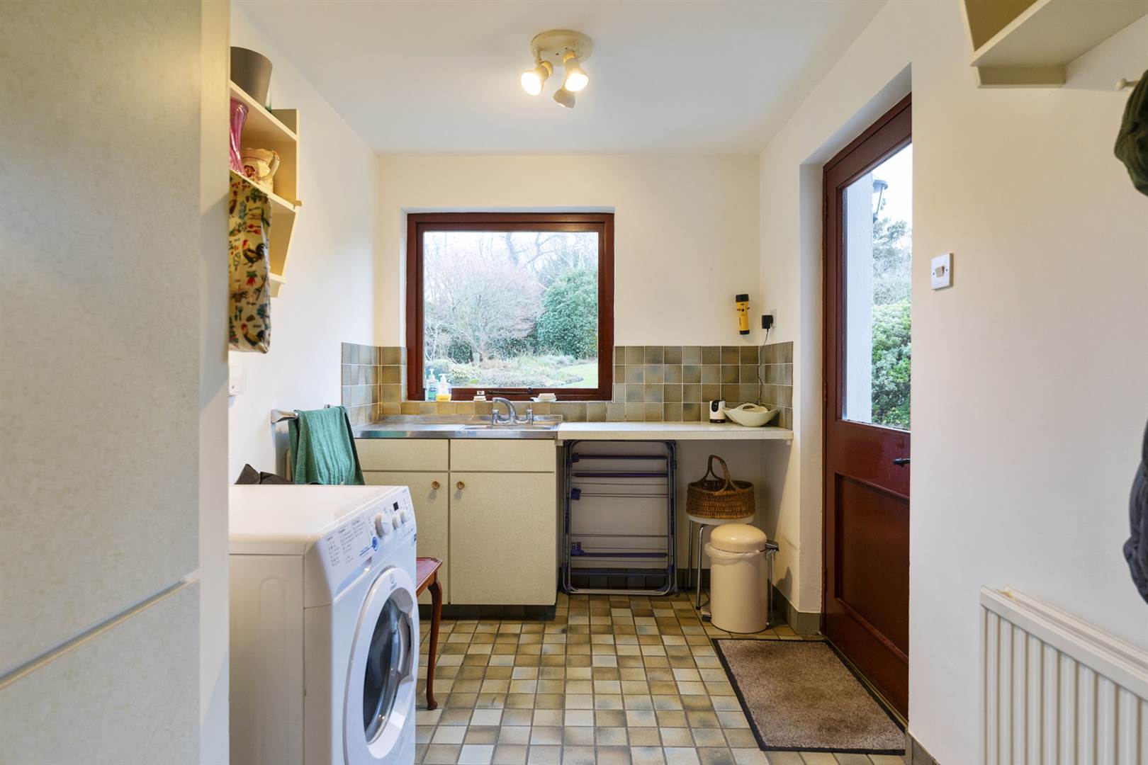 Built-in cupboards, single drainer stainless steel sink unit with mixer tap, plumbed for washing machine, tiled floor, glass door to patio and garden.