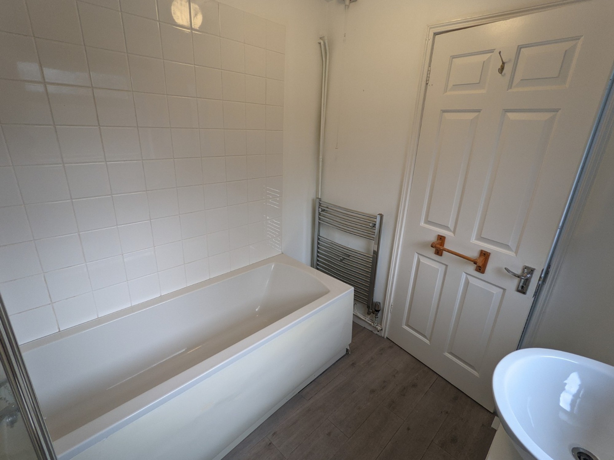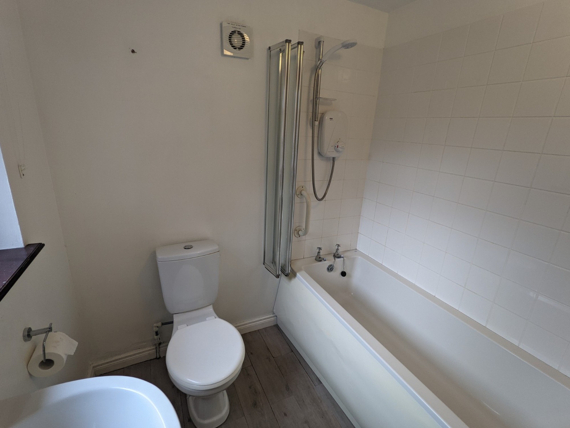 White bathroom suite with overhead power shower
