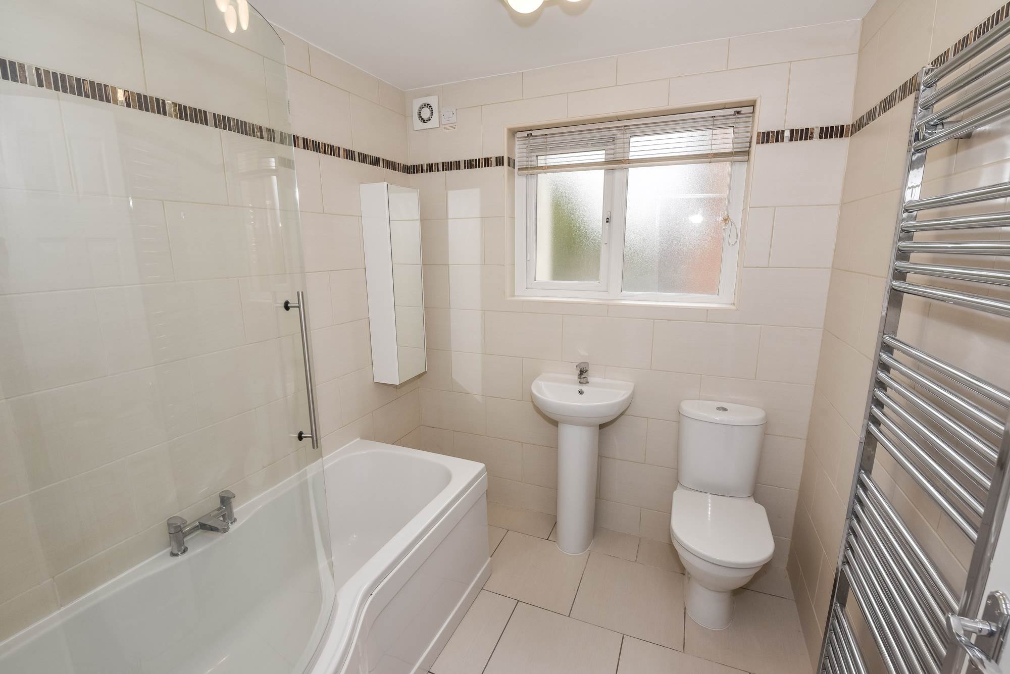 Ceramic tiled floor. Fully tiled walls. White suite comprising of low flush WC. Pedestal hand basin with chrome mixer taps. P-shaped panelled bath with chrome mixer taps and thermostatic telephone hand shower above. Curved and glazed shower screen. Extractor fan. Mirrored vanity unit. Heated chrome towel rail.