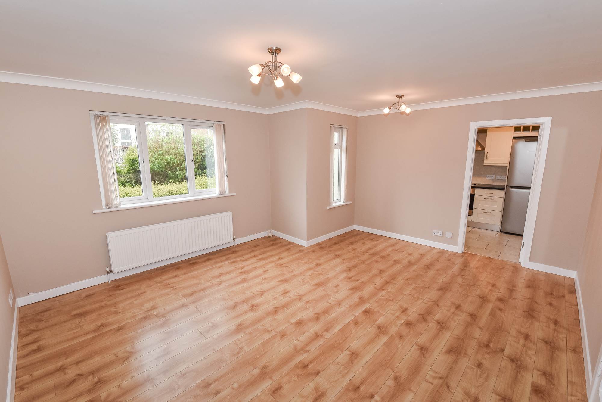 Laminate wood effect floor. Extractor fan. Shelved and railed cloaks. Shelved storage cupboard. Glazed door with side light leading through to lounge/dining area.