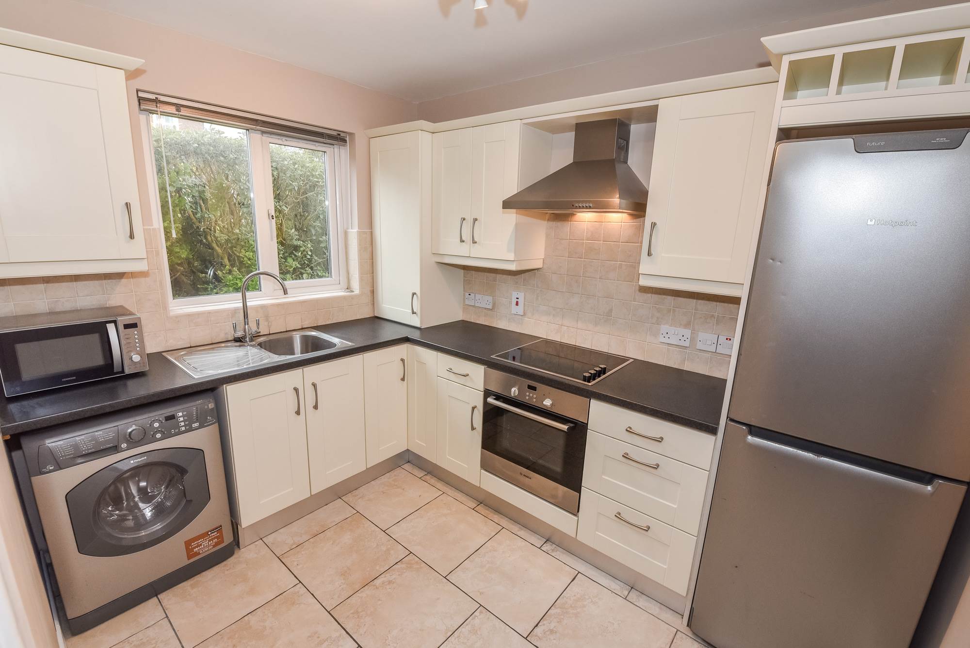 Ceramic tiled floor. Range of high and low level units. Space for washing machine. Integrated Bosch oven with four ring Bosch ceramic hob above with stainless steel extractor above. Laminate work top. Stainless steel Franke sink with drainer and chrome mixer taps. Space for American style fridge freezer. Enclosed Worcester boiler. Wine rack.