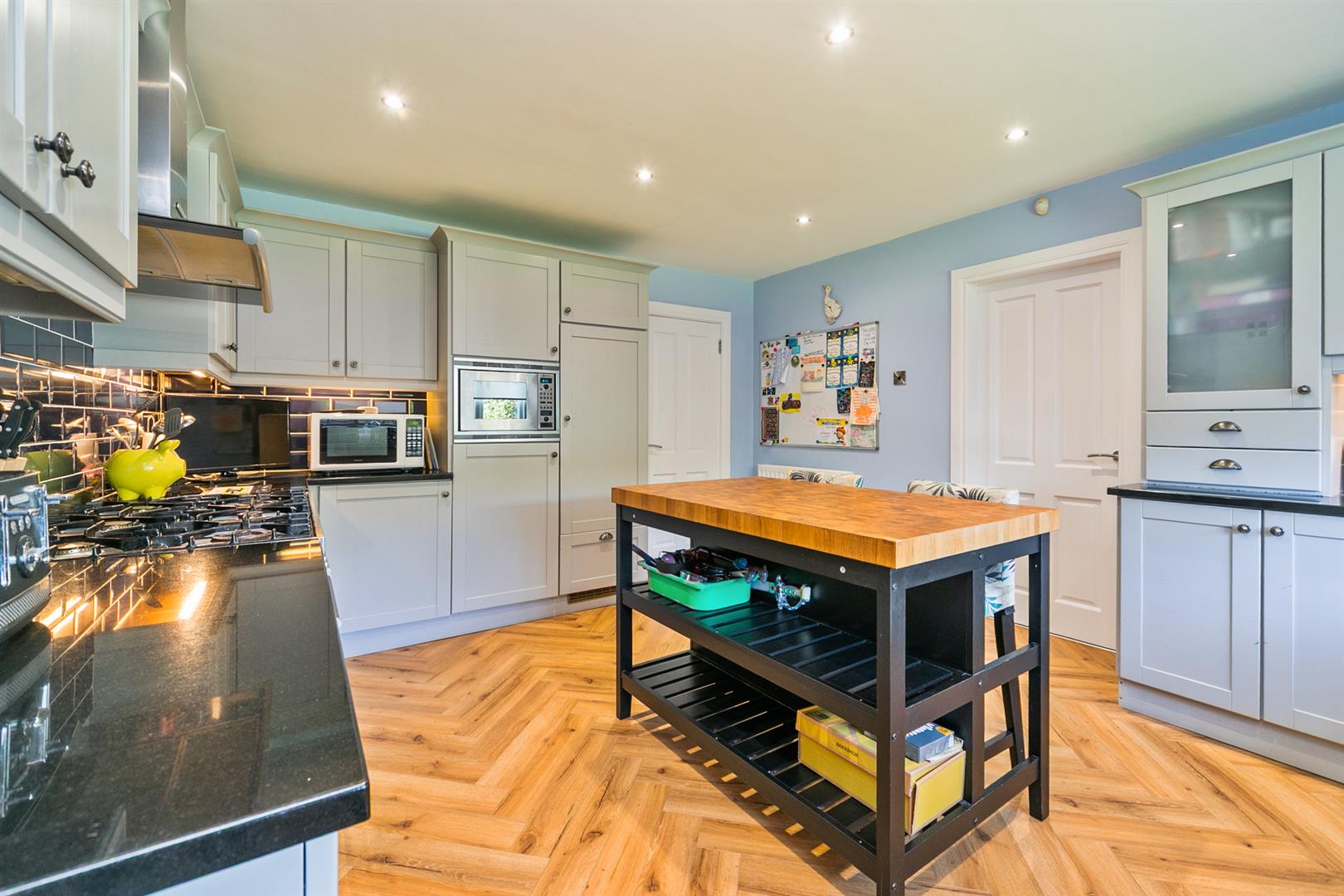 Contemporary kitchen with range of high and low rise units, integrated sink and tiled splash back. Recess for double oven with overhead stainless steel extractor fan. Integrated dish washer and fridge/freezer. Wooden flooring.