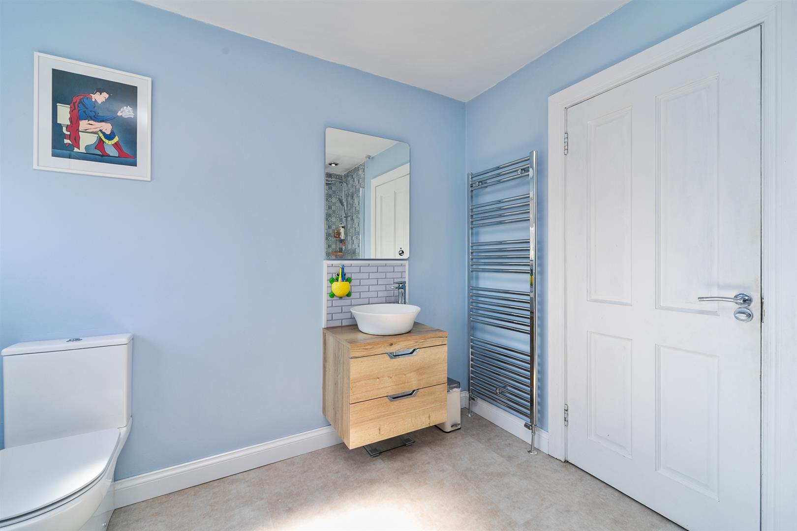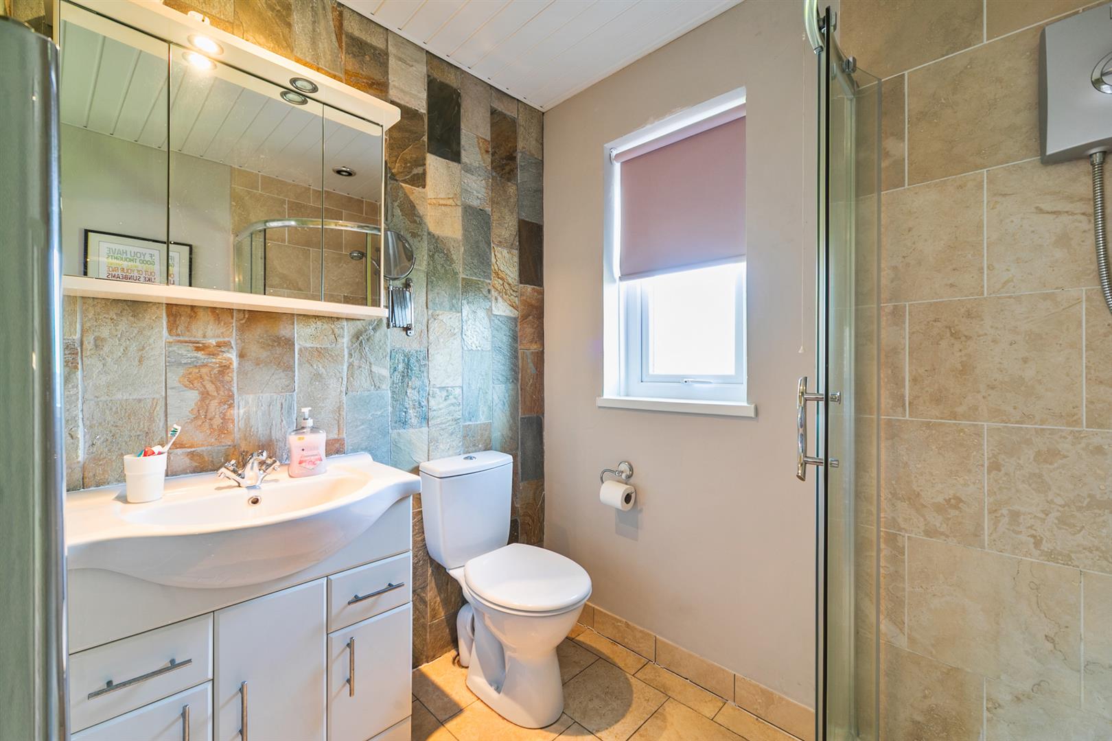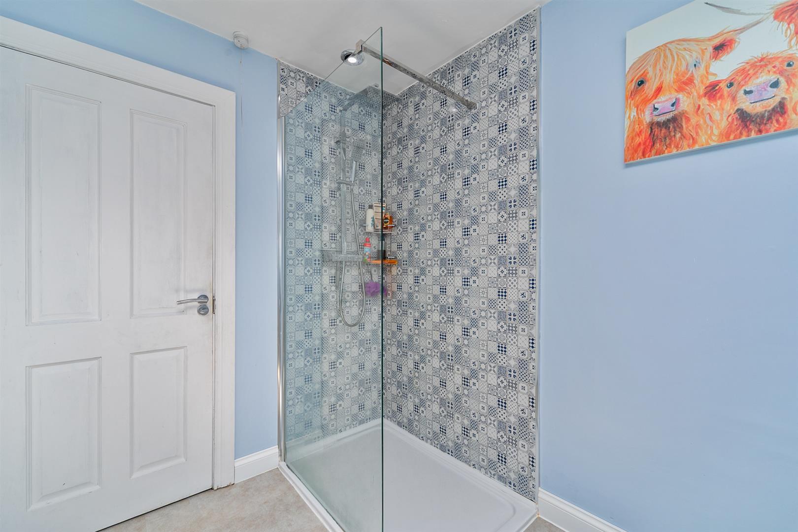 White suite encompassing low flush W/C, vanity wash hand unit, shower with feature tiling and bath. Towel radiator.