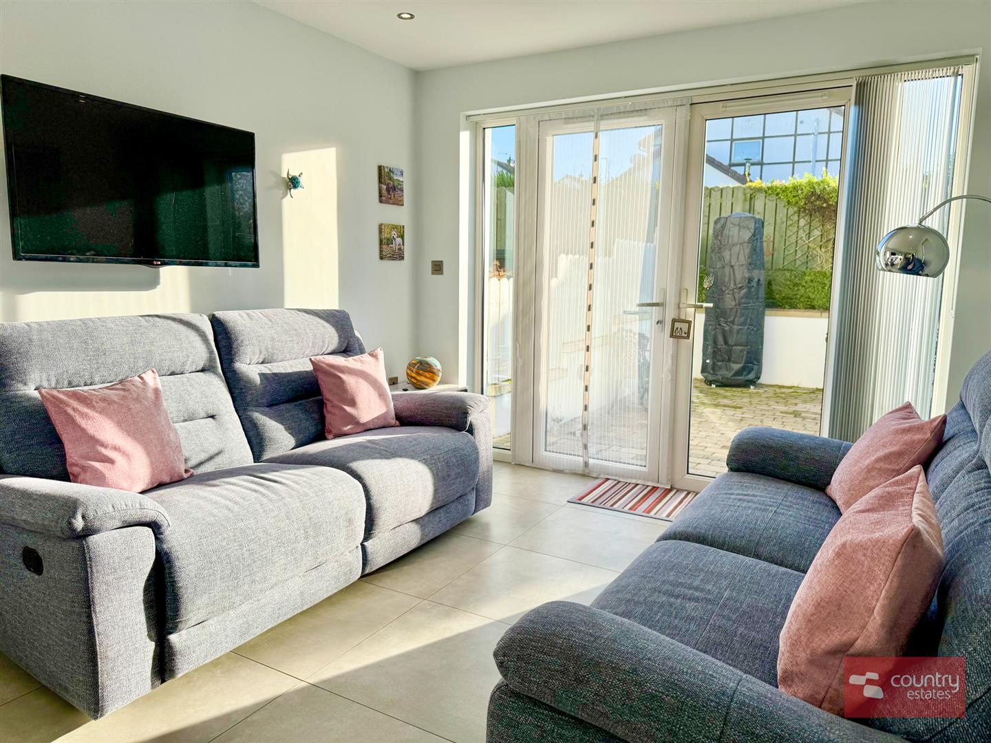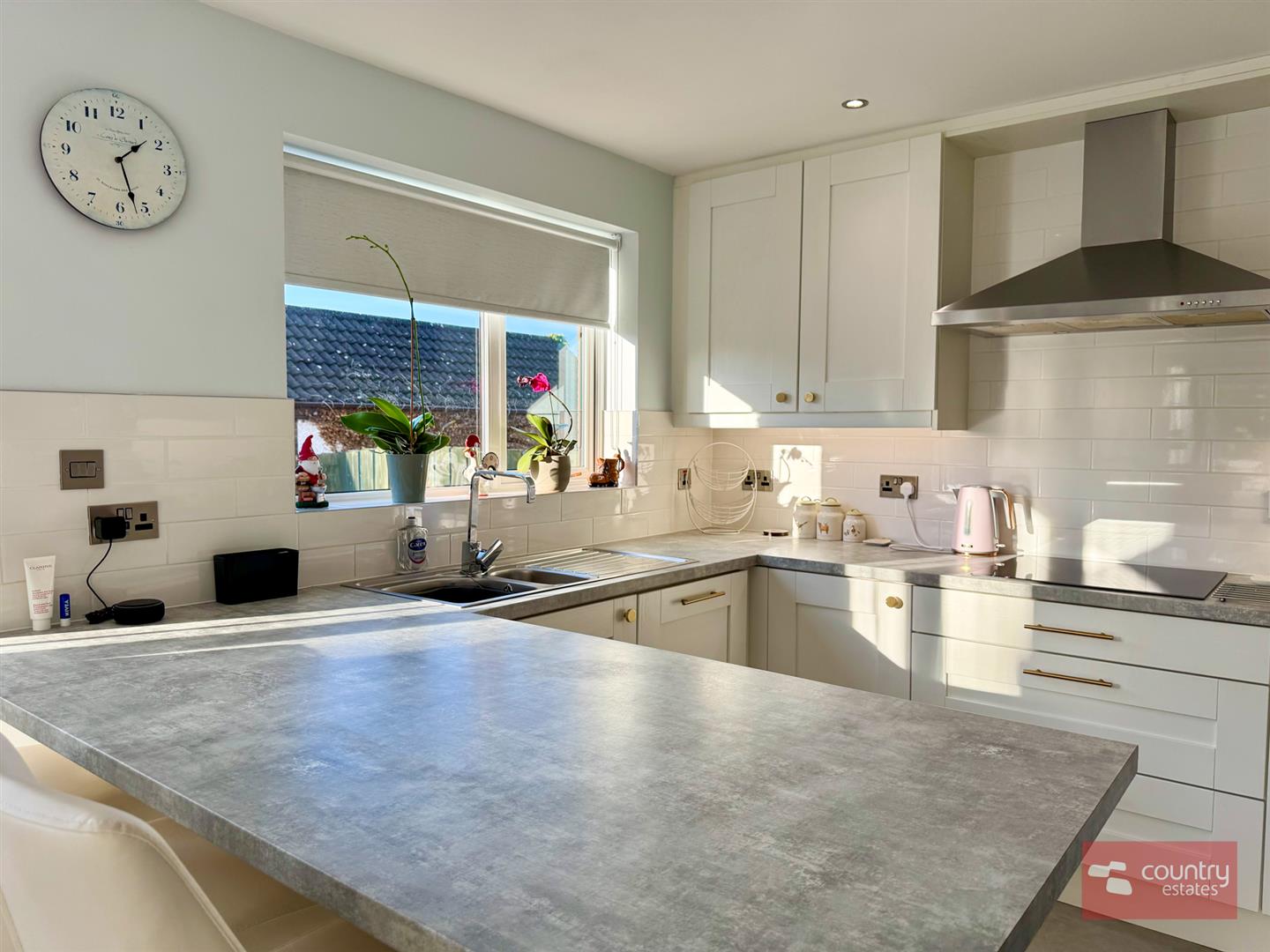 Comprising Luxury kitchen. Equipped with a comprehensive range of high and low level shaker style fitted units with contrasting worksurfaces and gold coloured handles. Breakfast bar style return for casual dining. A host of Integrated appliances including four ring induction hob with stainless steel extractor fan. Integrated dishwasher. Eye level Bosch combi with under oven. Stainless steel sink unit with large and small bowls and pillar mixer tap. Housing for freestanding American style fridge. Ceiling recessed downlighters. Tiled floor and tiled walls. Two sets of twin patio doors leading to side and rear private gardens.