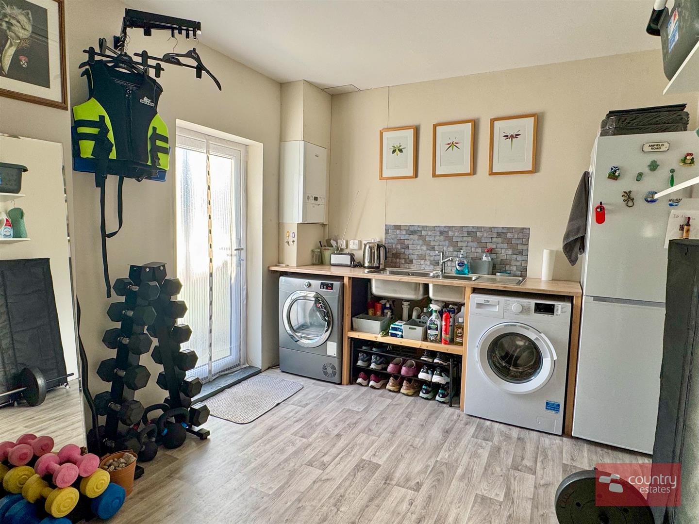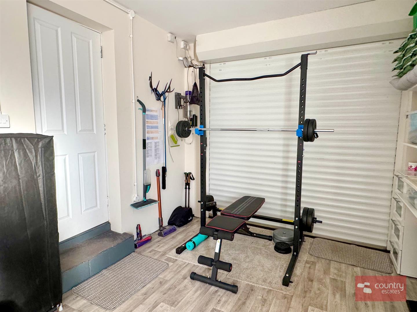 With electric roller door with utility area to rear with stainless steel twin sink unit with mixer tap. Laminate flooring. Plumbed for washing machine. Presently used as gym. PVC double glazed door to side.