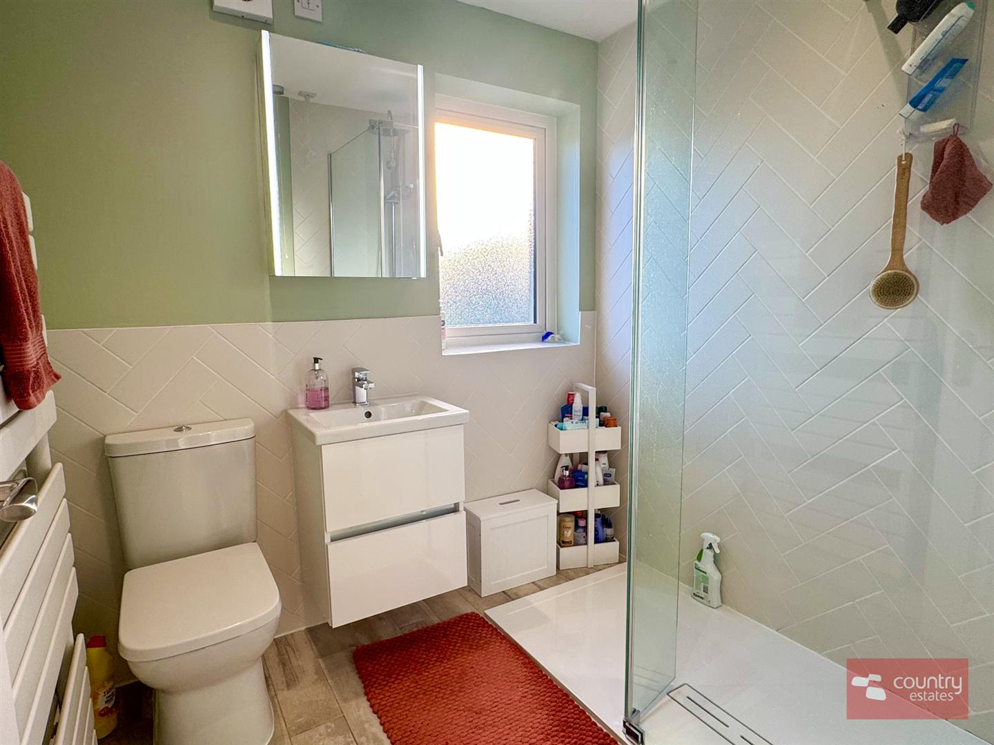 Comprising large open walk in shower enclosure with full height fixed shower screen, thermostatically controlled drench style shower with hand held shower attachment plus separate Mira Sport electric shower unit. Modern gloss white vanity unit with monobloc tap. Wall mounted modern towel radiator. Tiled accent walls and tiled whitewash effect tiled floor.