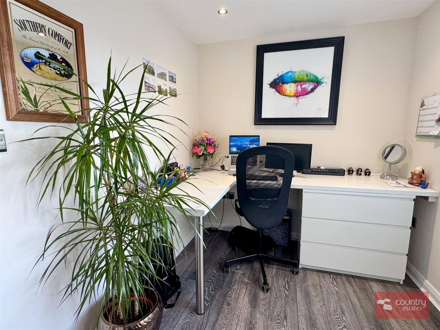Mahogany effect PVC double glazed entrance door with leaded glass side screen. Understairs storage cloakroom. Quality Walnut engineered flooring. Service door to garage (Presently set up as home gym with utility aspect).