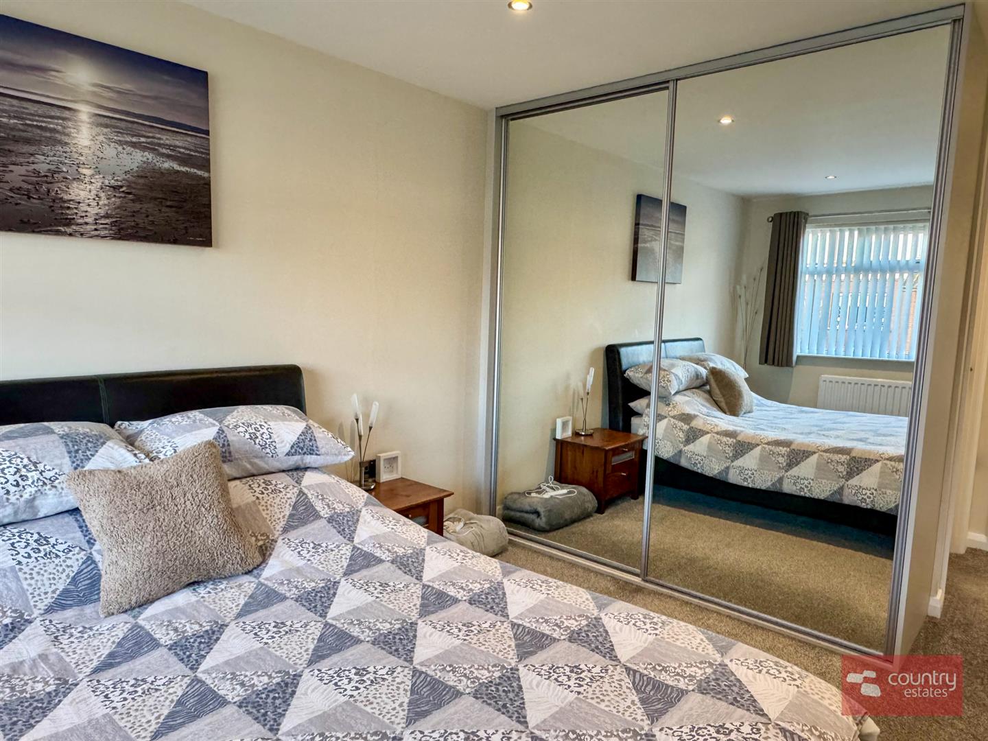 Ceiling downlighters. Built in double mirrored sliderobe.