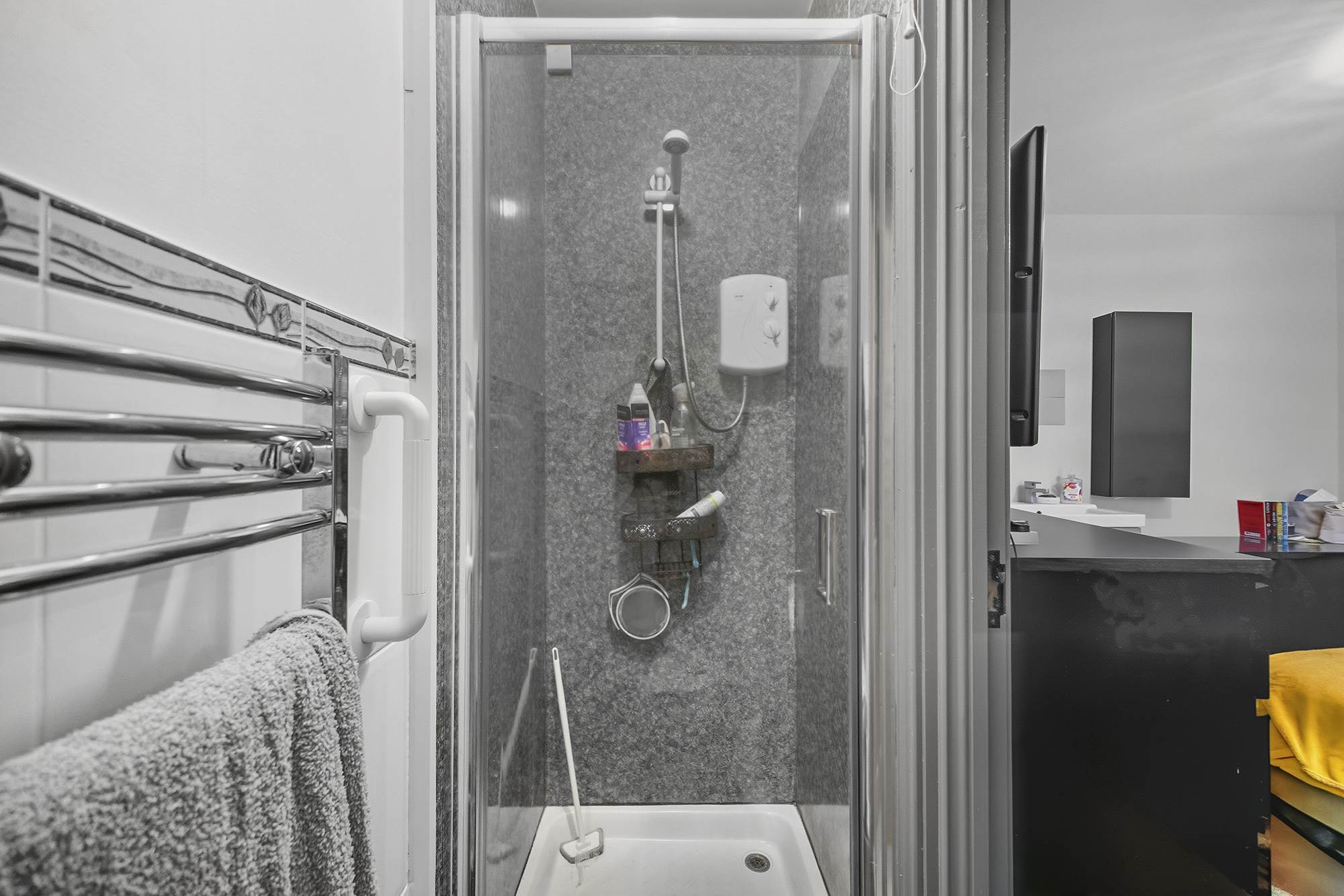 Comprising shower cubicle, low flush wc, chrome heated towel rail.