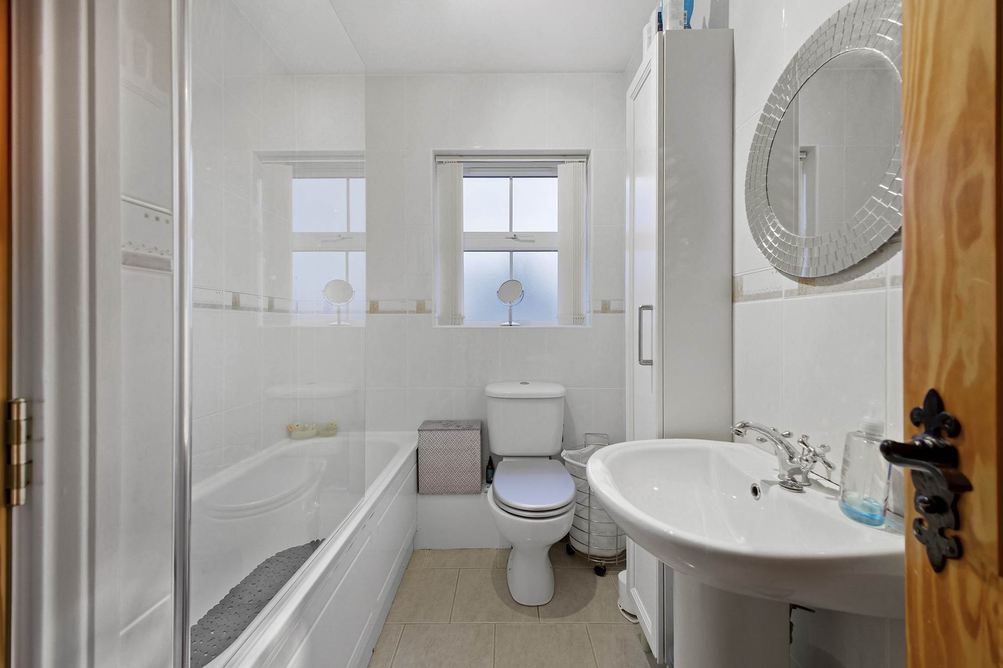 Stylish first floor bathroom with modern white suite and shower over bath