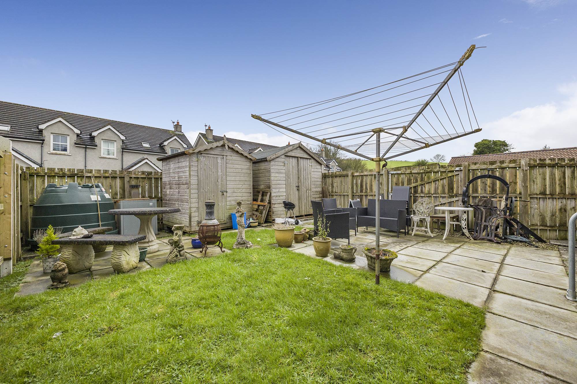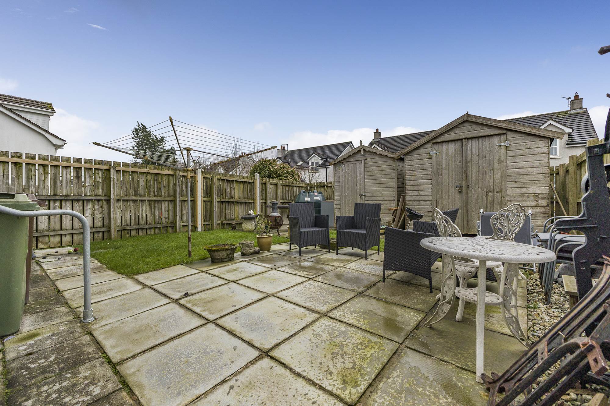 Enclosed rear garden with neat lawns and patio area