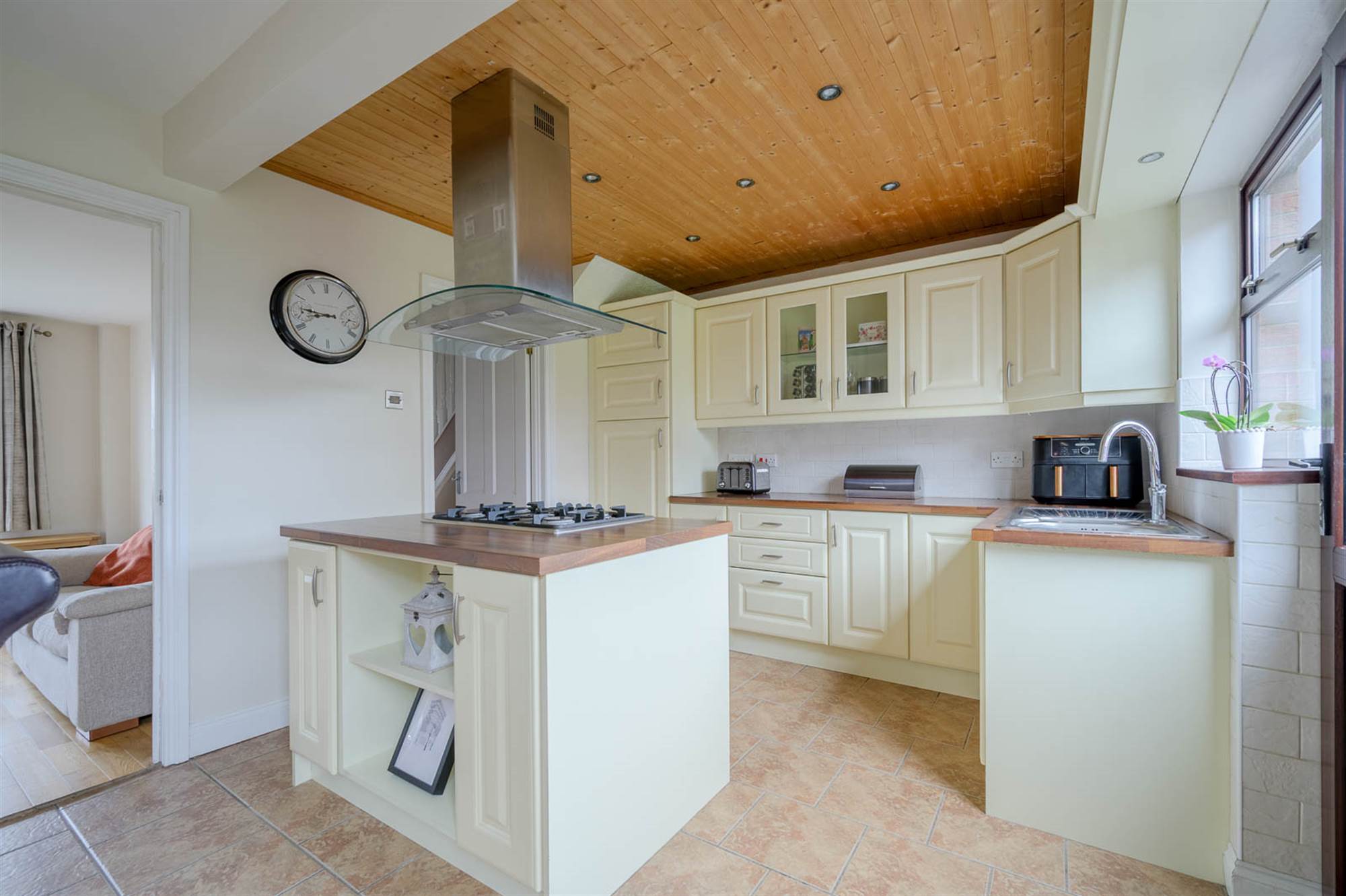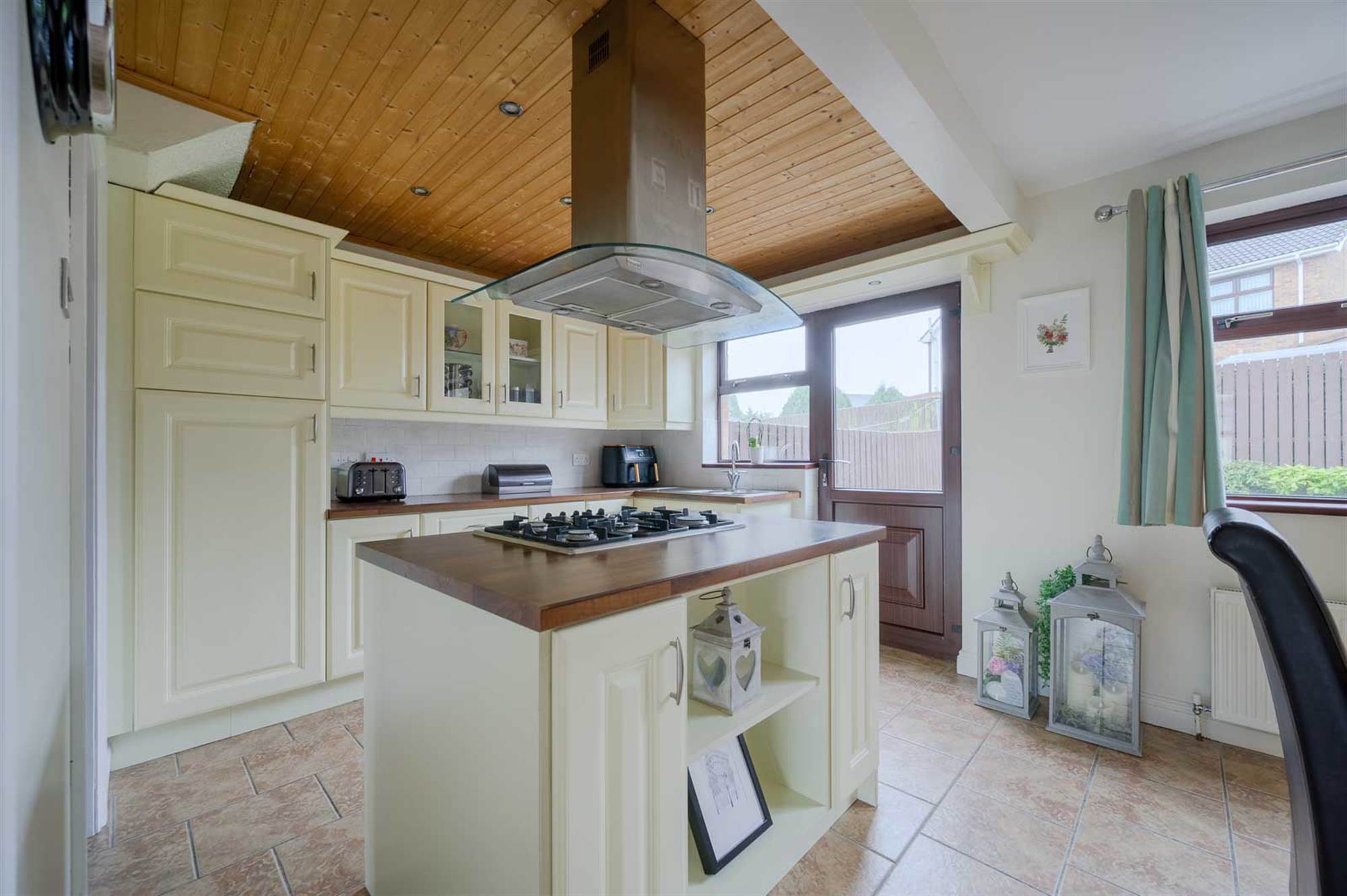 Range of high and low level units, one and a half bowl stainless steel sink unit with mixer tap, integrated fridge, under bench oven, five ring gas hob, extractor fan, ceramic tiled floor, Island unit.