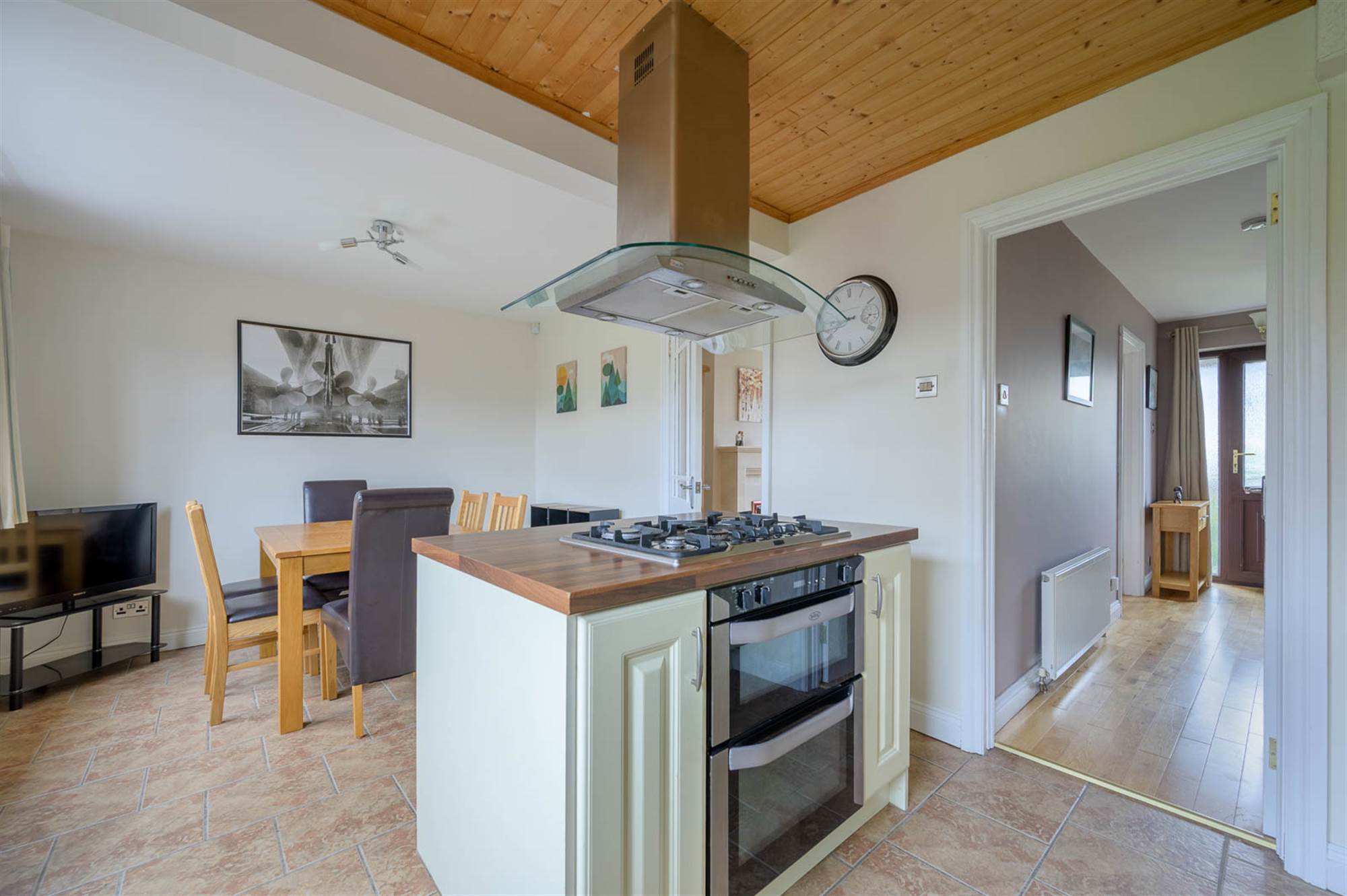 Fitted kitchen with integrated appliances and dining area