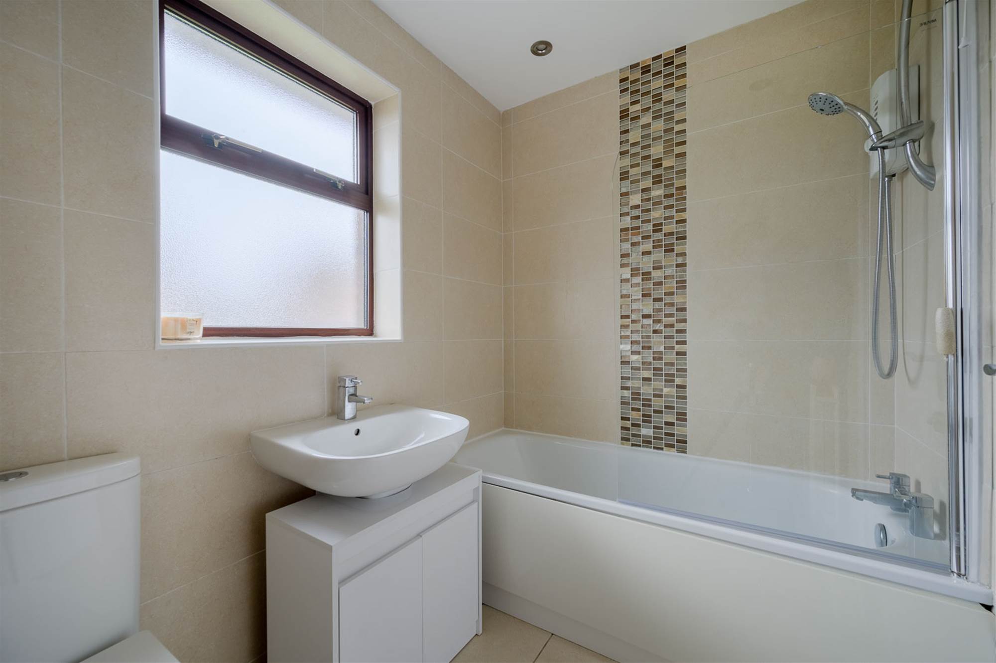 Panelled bath with mixer tap, electric shower. Pedestal wash hand basin, low flush wc, fully tiled with ceramic tiles, spotlights.