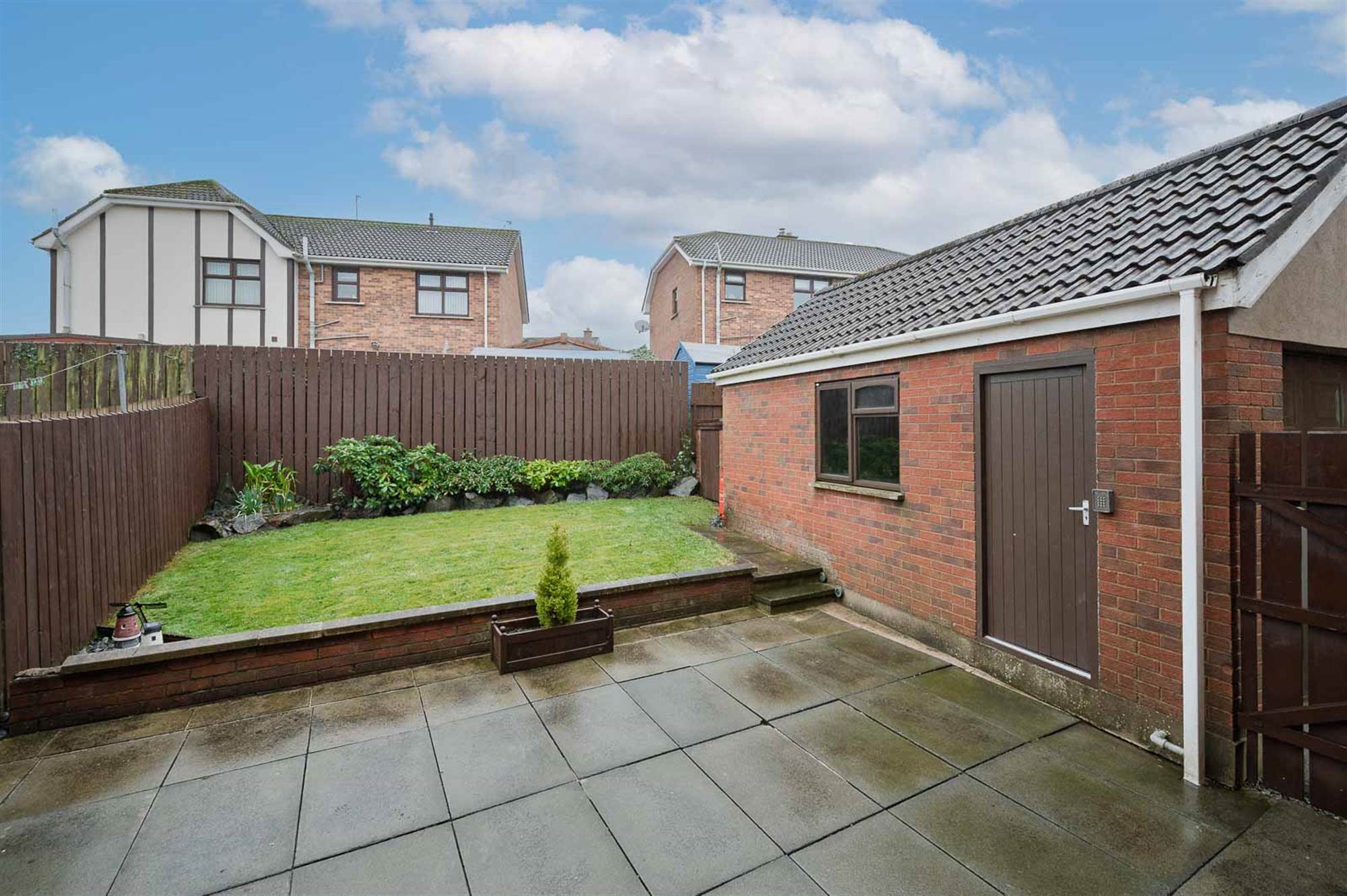 Front garden in lawn. Private enclosed gardens to the rear with patio area, uPVC oil tank and detached garage.