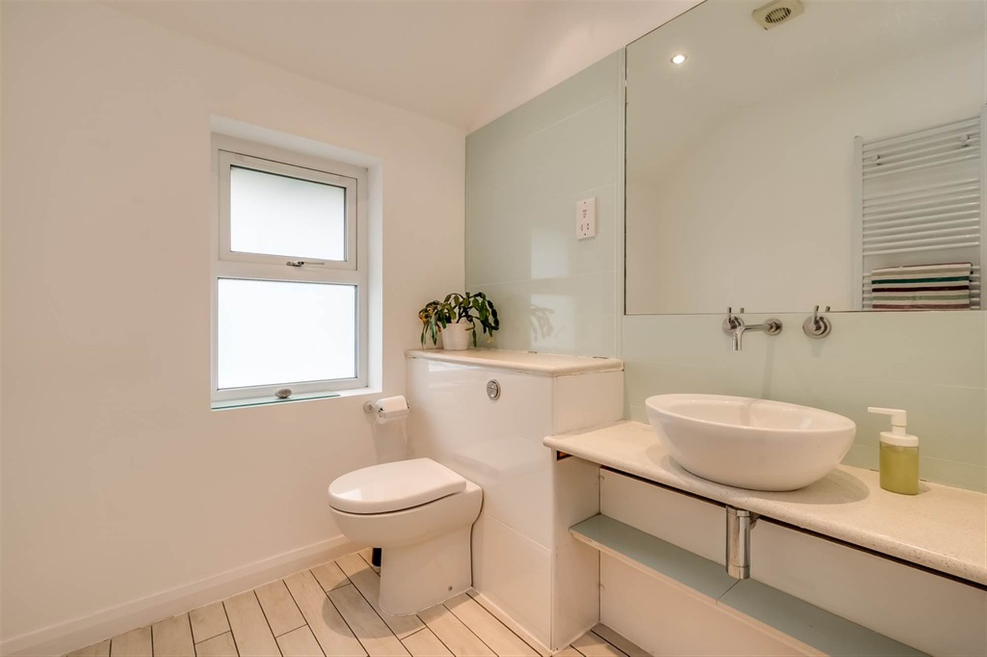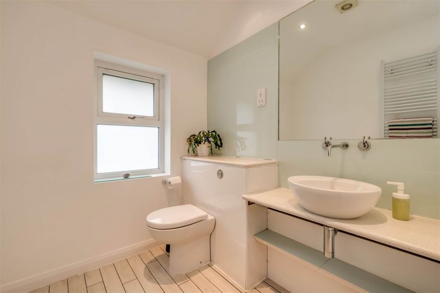 Counter top basin and wall mounted mixer tap. Feature lighting. WC with concealed cistern. Composite stone worktops. 'Porcellanosa' tiled wall and integrated mirror. Tiled floor. Heated towel rail.