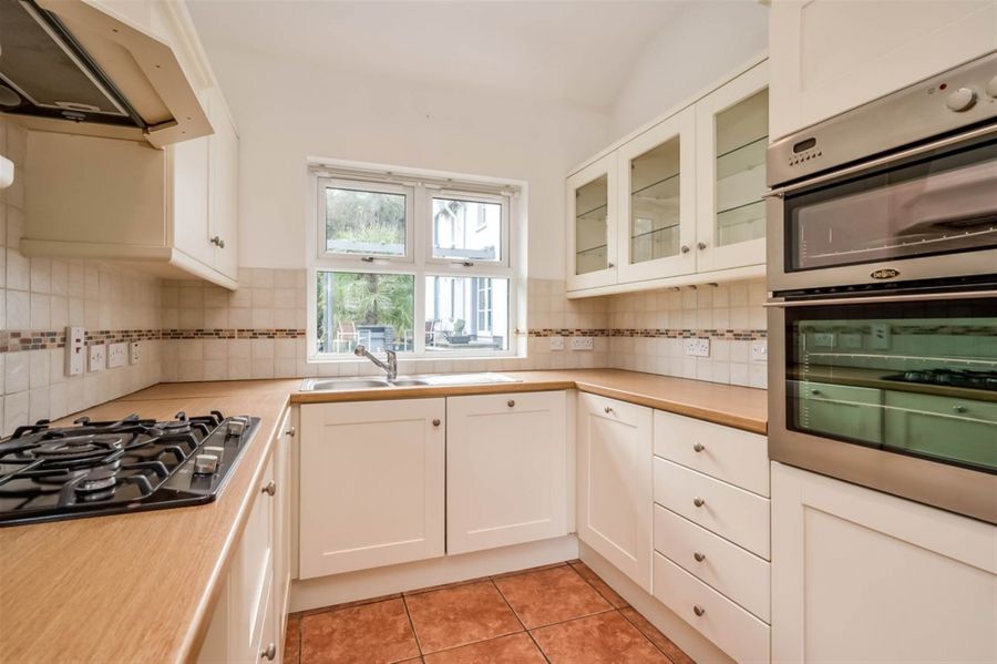 Range of white kitchen units and built-in appliances open to . . .