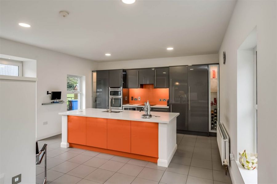 High gloss gunmetal grey units with white sold surface worktops. Feature glass splashback. Island unit. Glazed display cabinets doors. Feature lighting. Neutral grey porcelain tiled floor. French doors to patio and pergola area and side garden. Bay window with sliding doors to outdoor seating area. Integrated 'Neff' oven, microwave, and induction hob. Extractor fan. Plumbed for dishwasher.