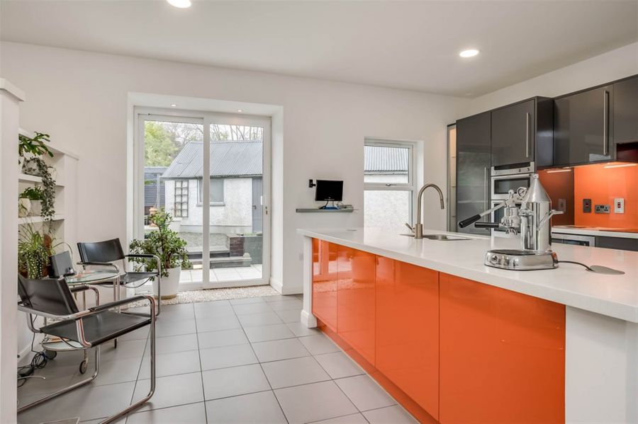 Services to washing machine. Tumble dryer. Freezer. Range of white high gloss cupboards. White tiled splashbacks. Sink unit. Extractor fan. Grey porcelain tiled floor.