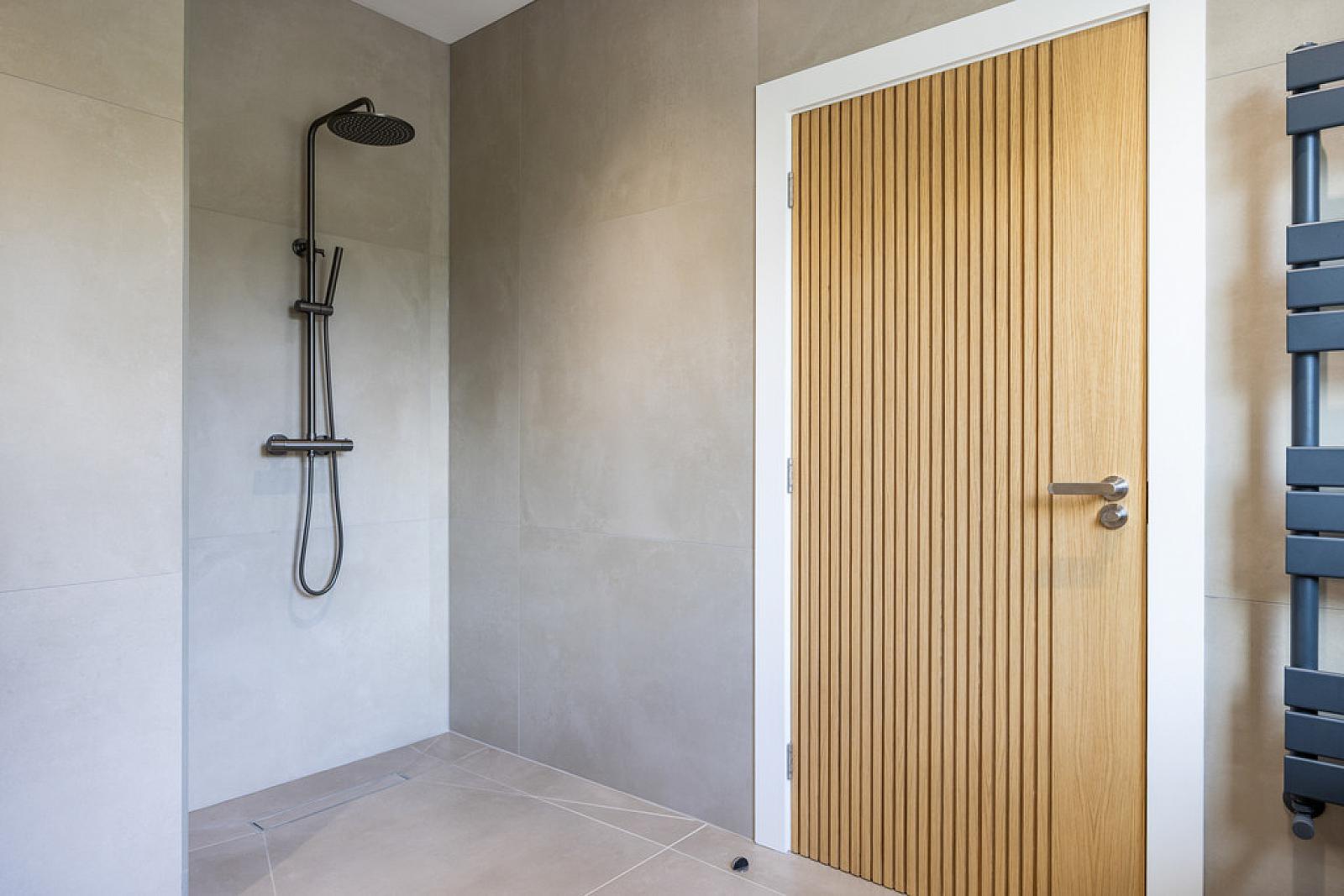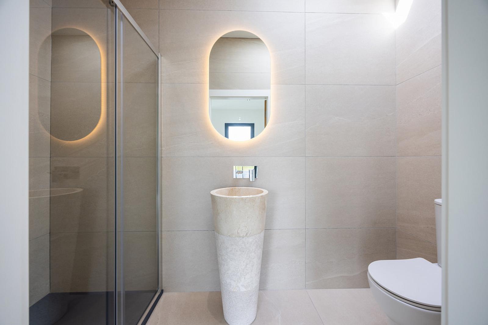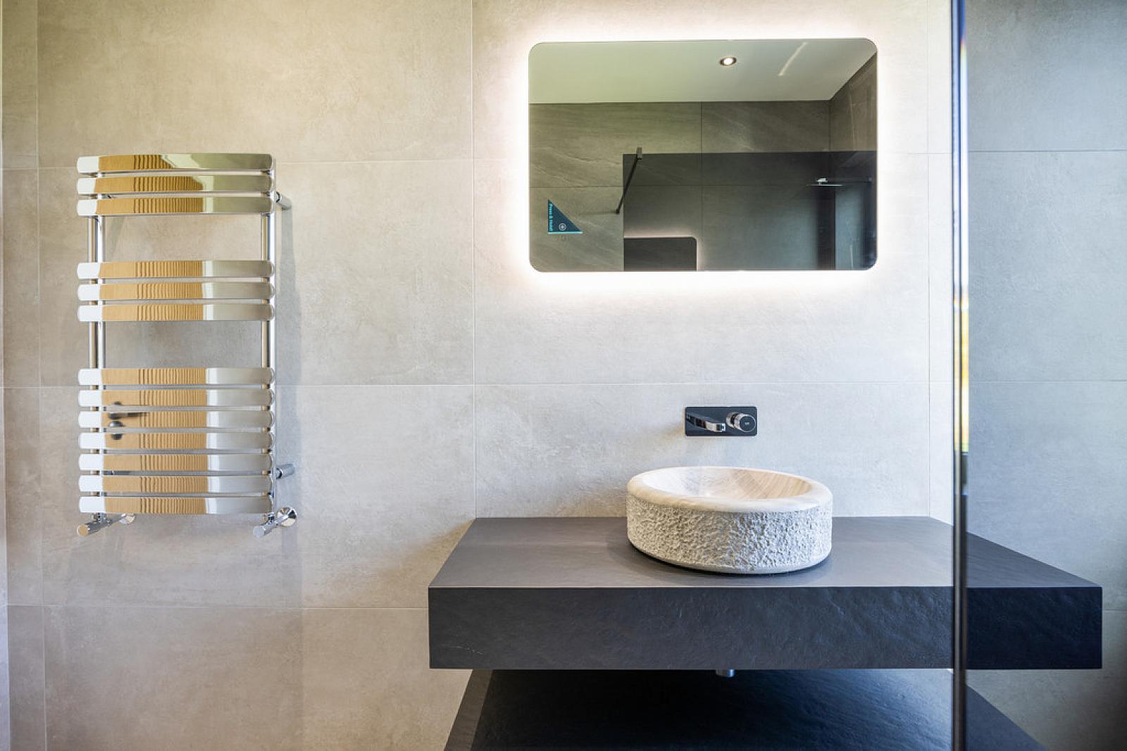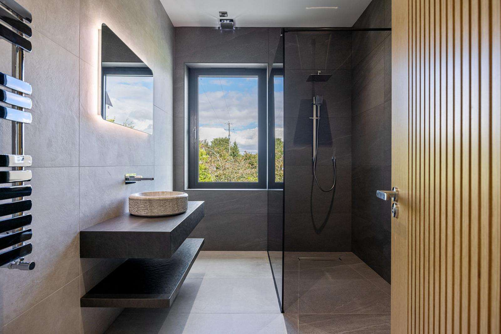 ENSUITE Walk in shower cubicle with Drencher and hand shower, feature sink unit with Rak ceramics tiling, low flush WC, stainless steel towel radiator, tiled walls, tiled floor, feature mirror with light, recessed low voltage spotlights.