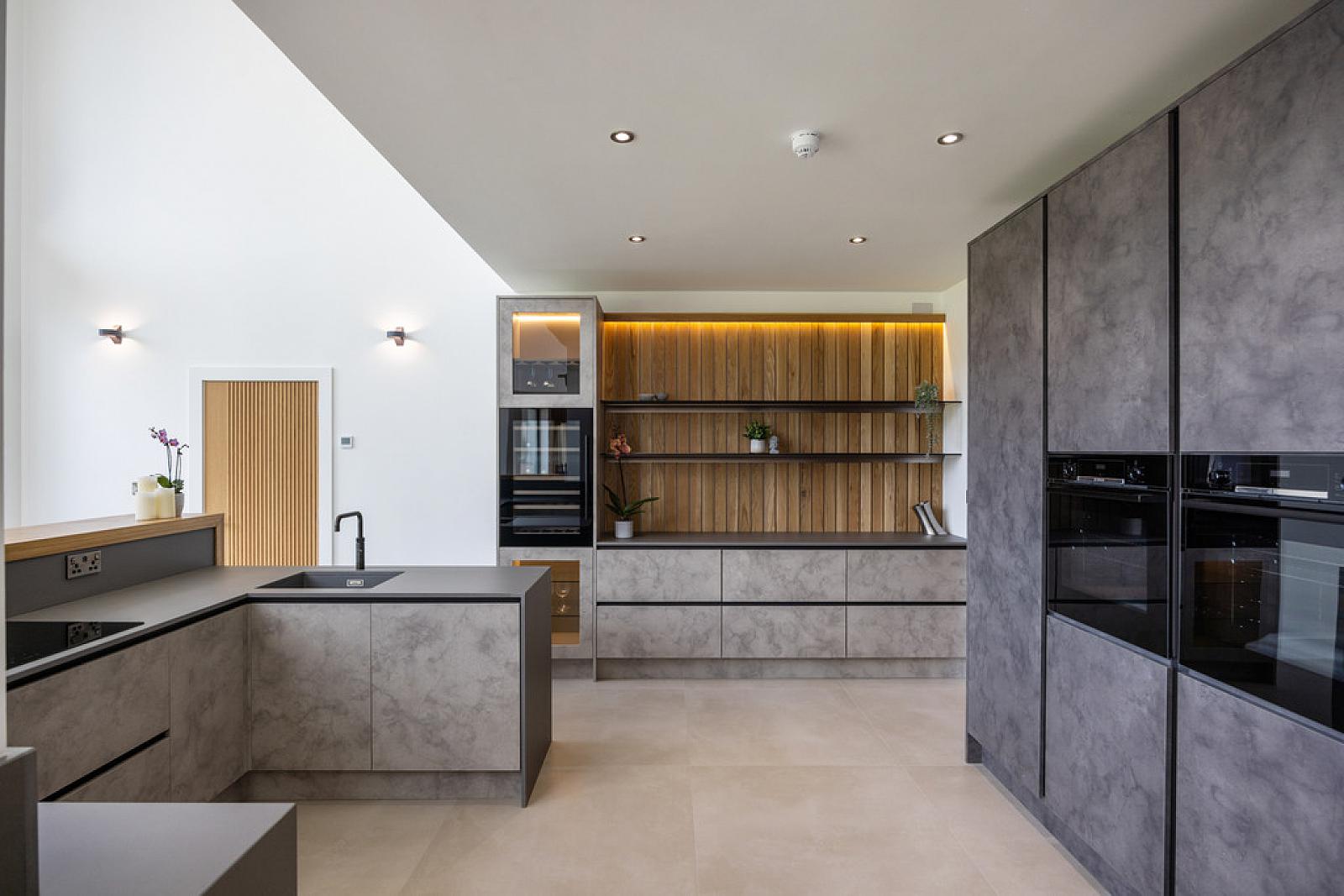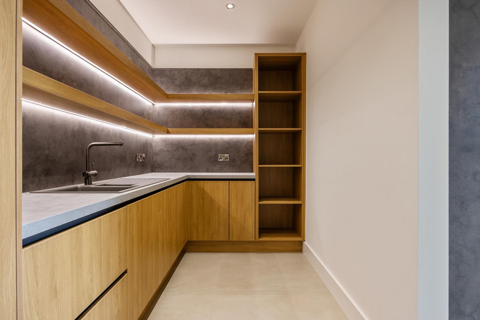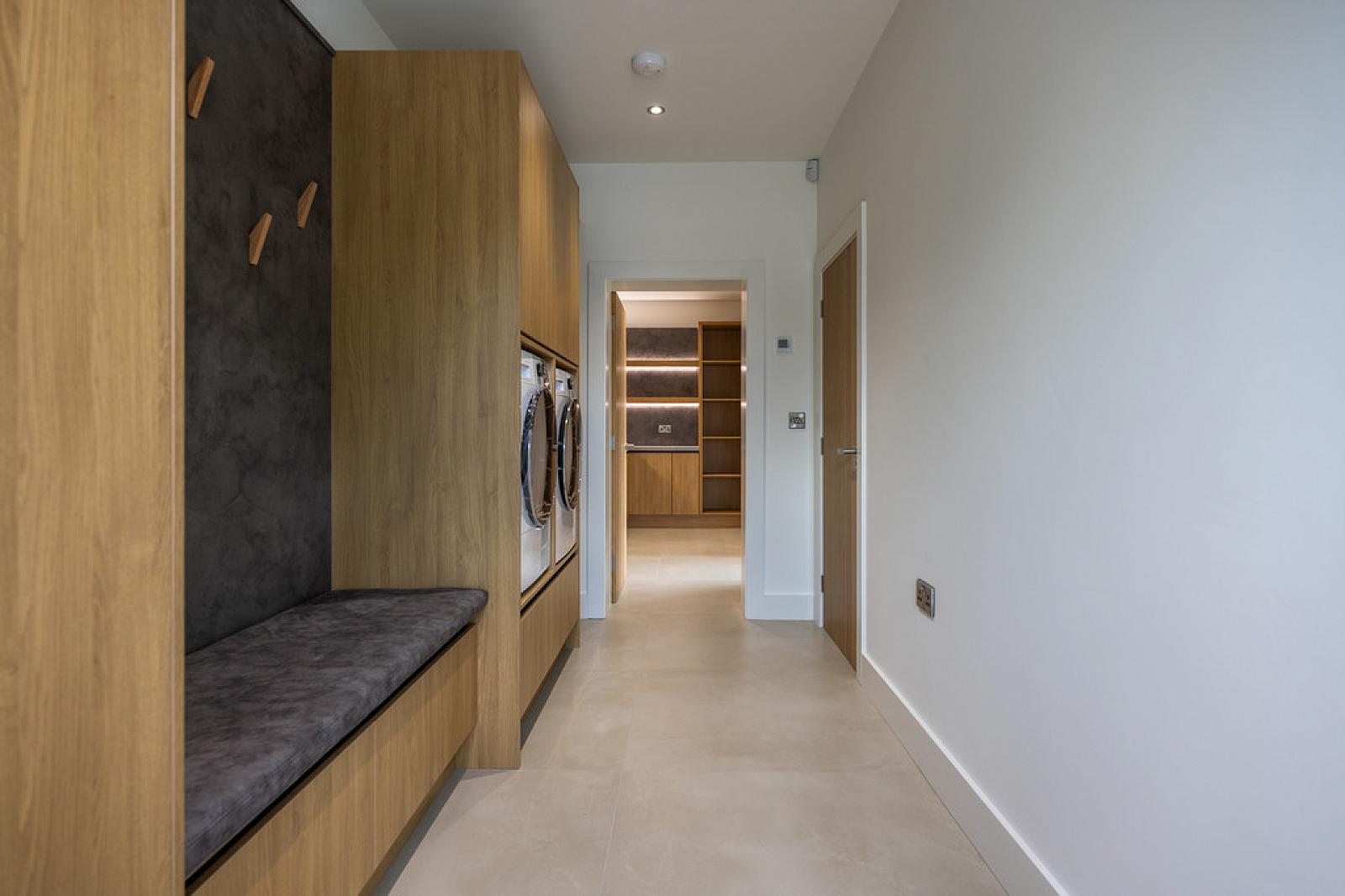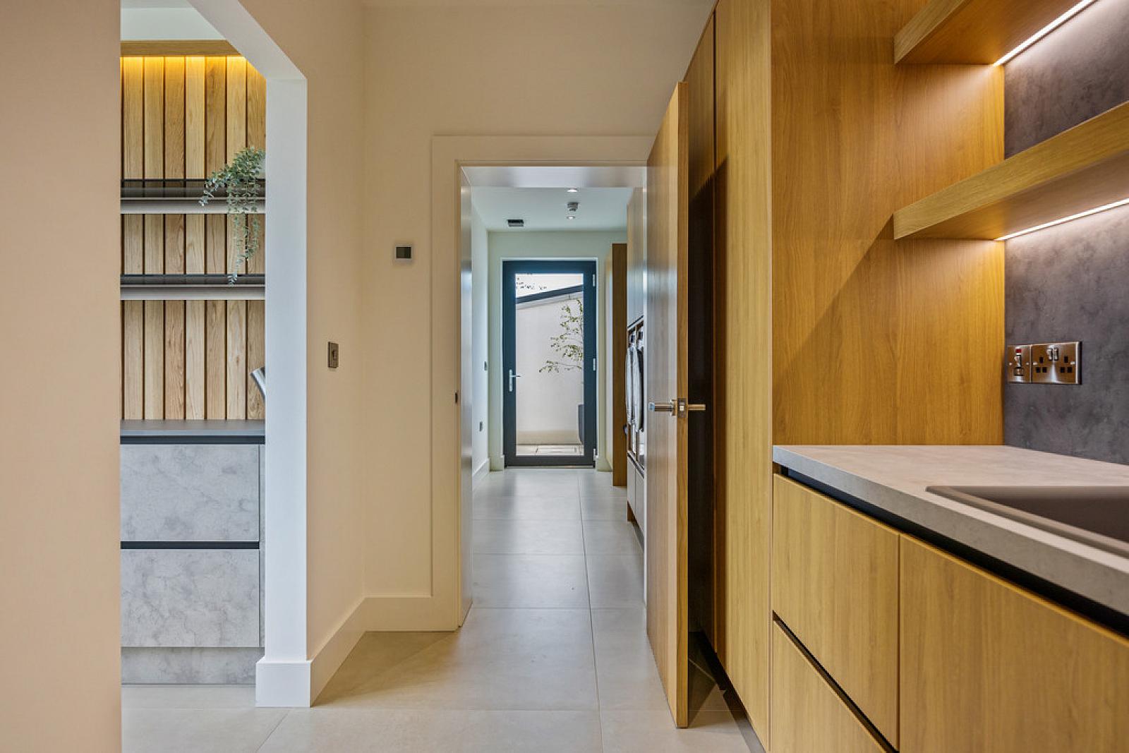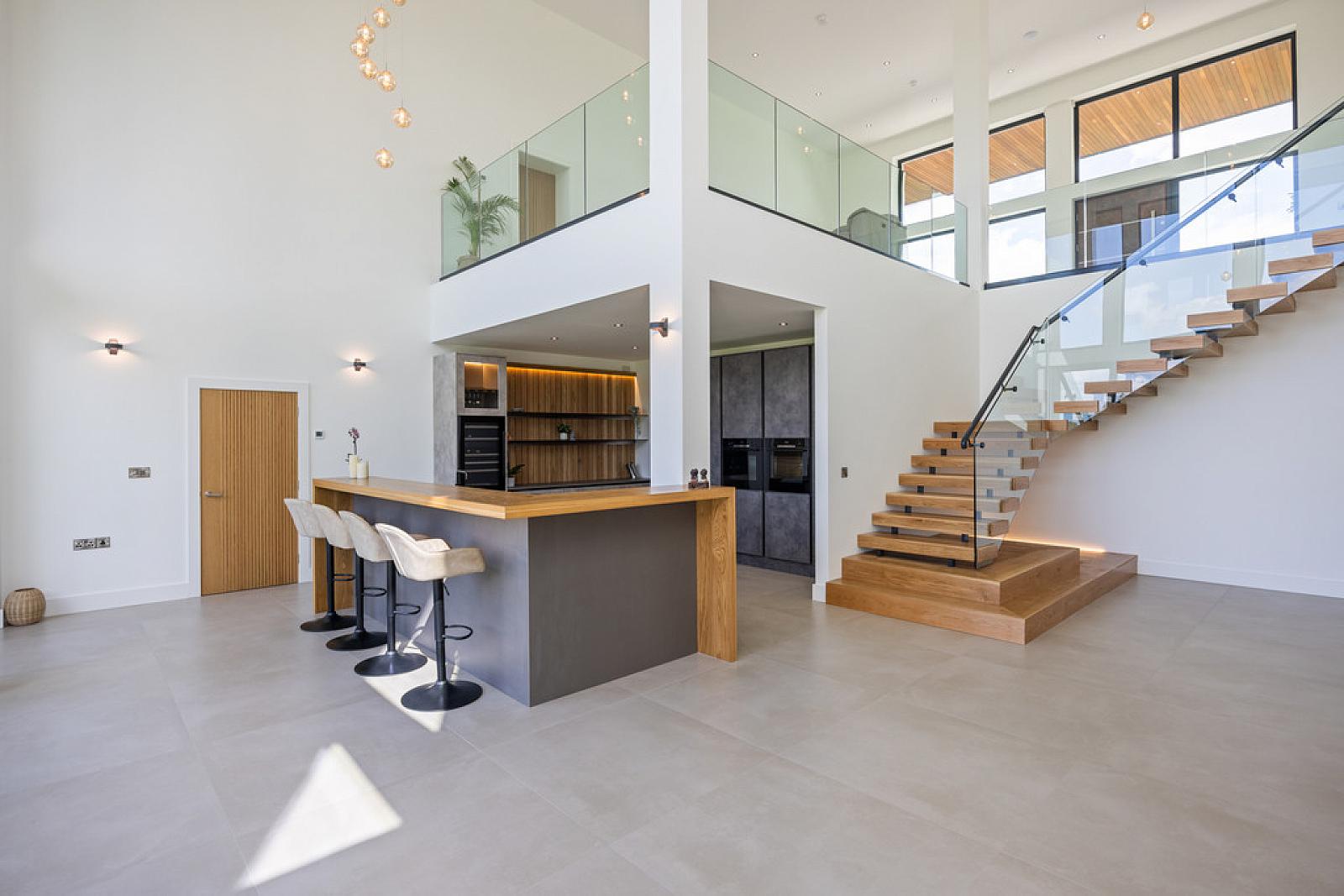 Inside, the property is a showcase of contemporary design. Striking bespoke joinery, modern timber wall panelling and a dramatic 'floating' staircase create a bold architectural statement, while the interior finishes exude quality at every turn. The principal living spaces are both impressive and practical, designed for modern life while maintaining a sense of refined elegance. The kitchen is a triumph of design and specification, featuring seamless monolithic worksurfaces, a range of integrated appliances including a wine fridge and the convenience of a Quooker boiling water tap. A separate prep kitchen with fitted units makes entertaining effortless, while a utility and boot room add further practicality.
