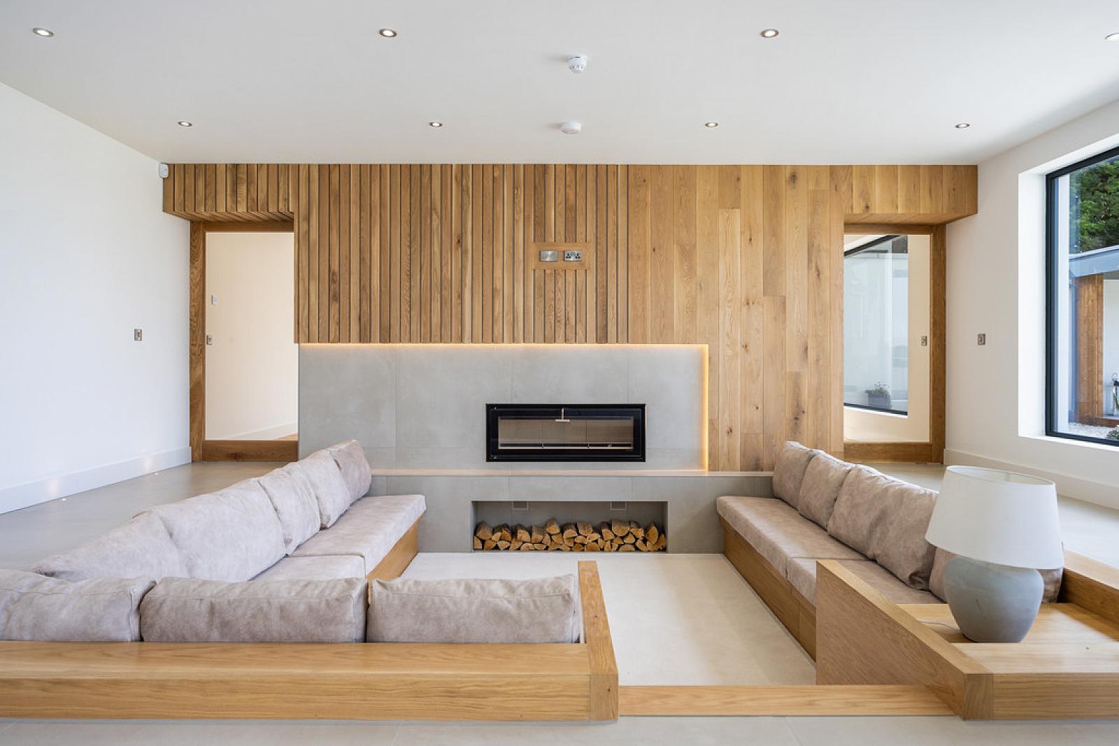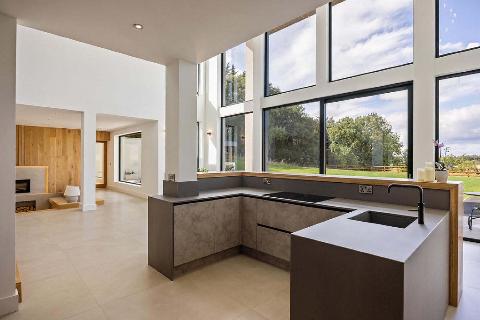 OPEN PLAN LIVING / KITCHEN / DINING AREA WITH CONVERSATION PIT 44' 7" x 29' 8" (13.6m x 9.05m) (@ widest points) Luxury bespoke kitchen with range of fitted high and low level units, Neolith work surfaces and splashback, Oak counter top island unit, integrated induction hob with down draft extraction, feature sink unit with Quooker tap, twin integrated fridge, integrated wine fridge, glazed storage cupboard, feature shelving, tiled floor, integrated dishwasher, feature lighting, part timber panelled walls, floor to ceiling windows, sliding patio door to rear. Conversation Pit with sunken seating area, contemporary wood burning stove, feature floor lighting, recessed low voltage spotlights, glazed pocket doors leading to family room.