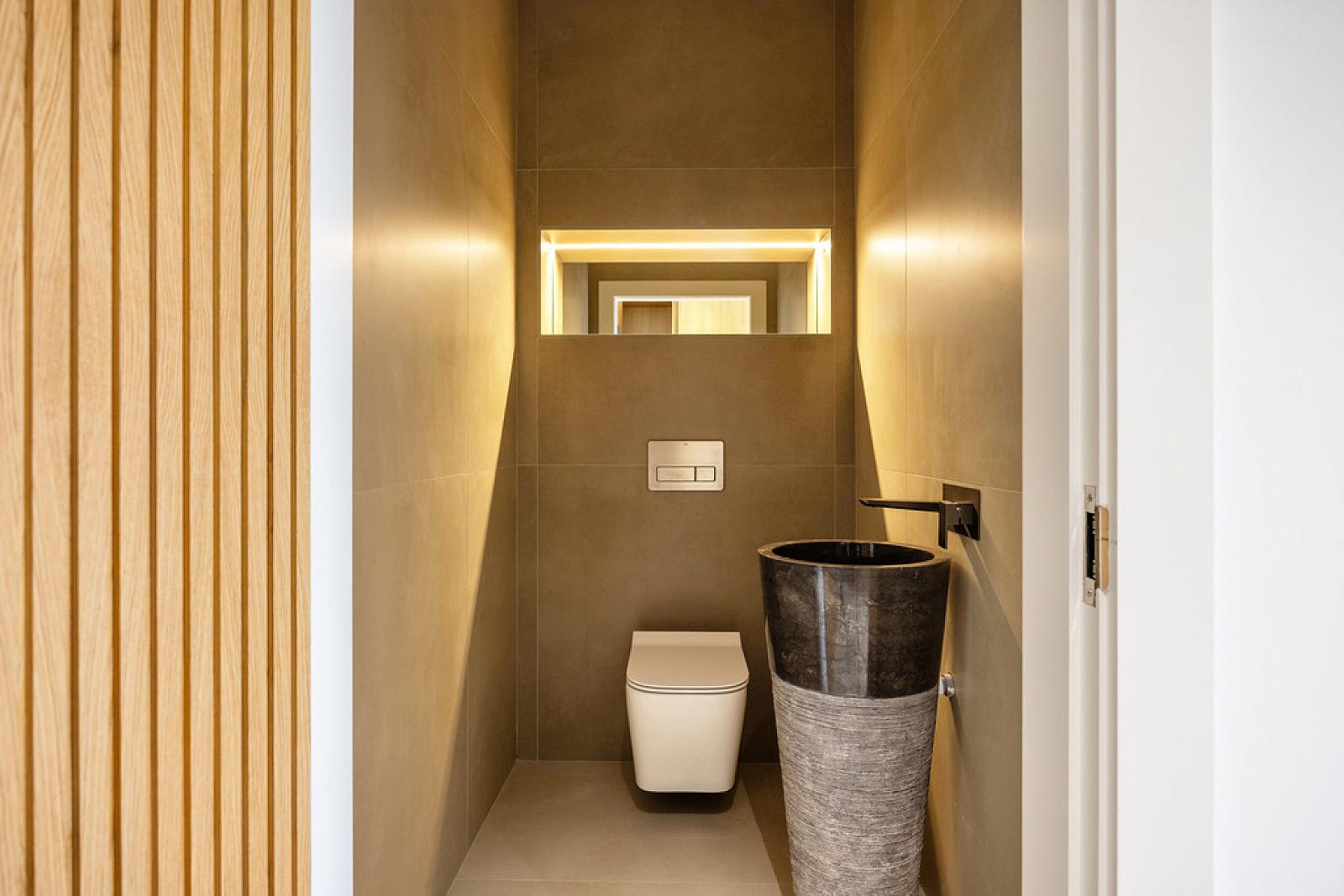 WC Low flush WC, concealed cistern, feature wash hand basin, tiled floor, tiled walls, recessed low voltage spotlights, extractor fan.