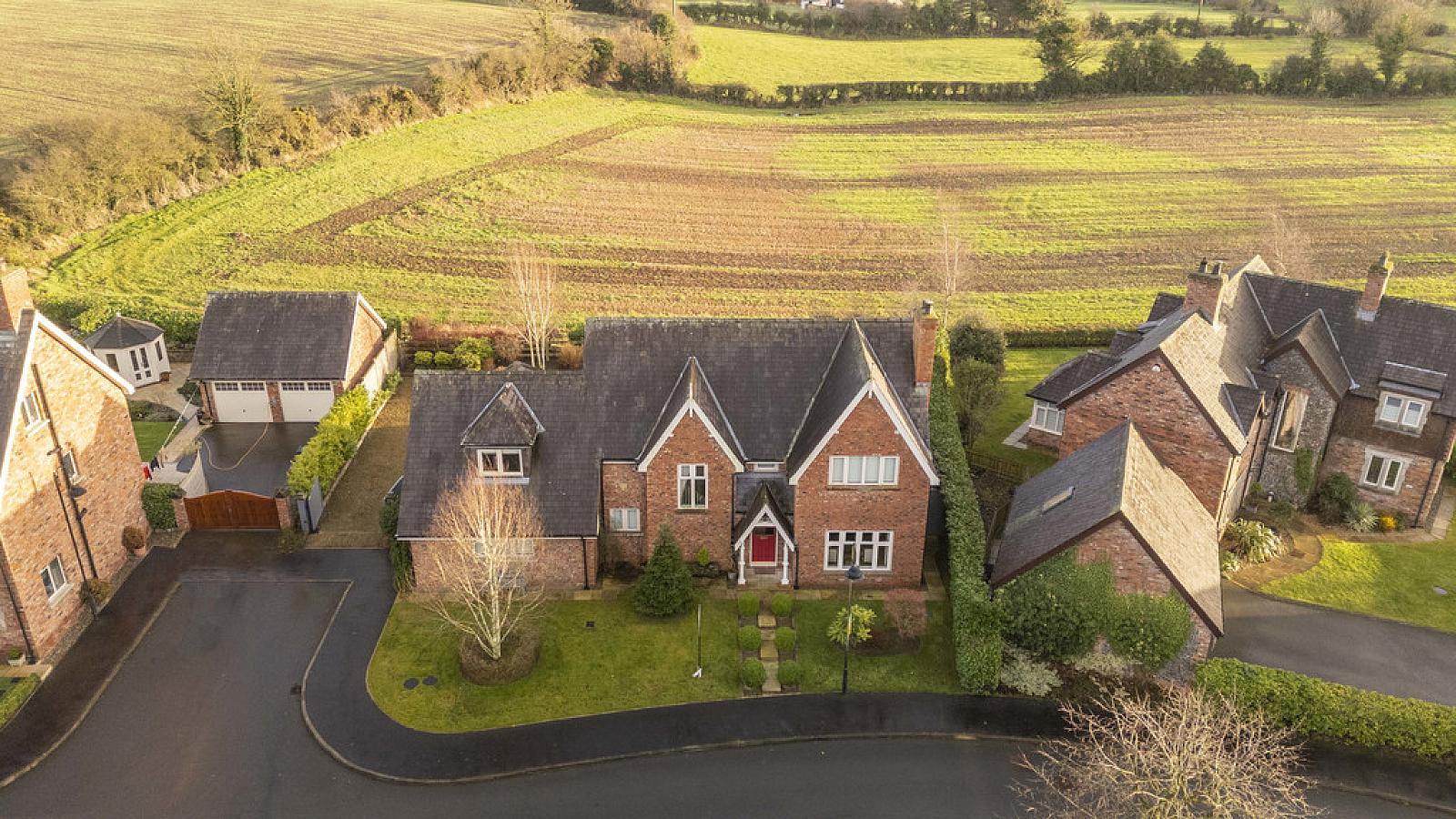 Occupying one of the finest sites within the prestigious Governors Gate development on the Ballynahinch Road, Royal Hillsborough, this bespoke detached family home was designed by Alan Patterson Design and built by Stephen and Angela Thompson. Set on a double building lot with a south facing rear garden, the property enjoys a secluded cul-de-sac position with uninterrupted open farmland to the rear, excellent privacy and no traffic noise from the A1.