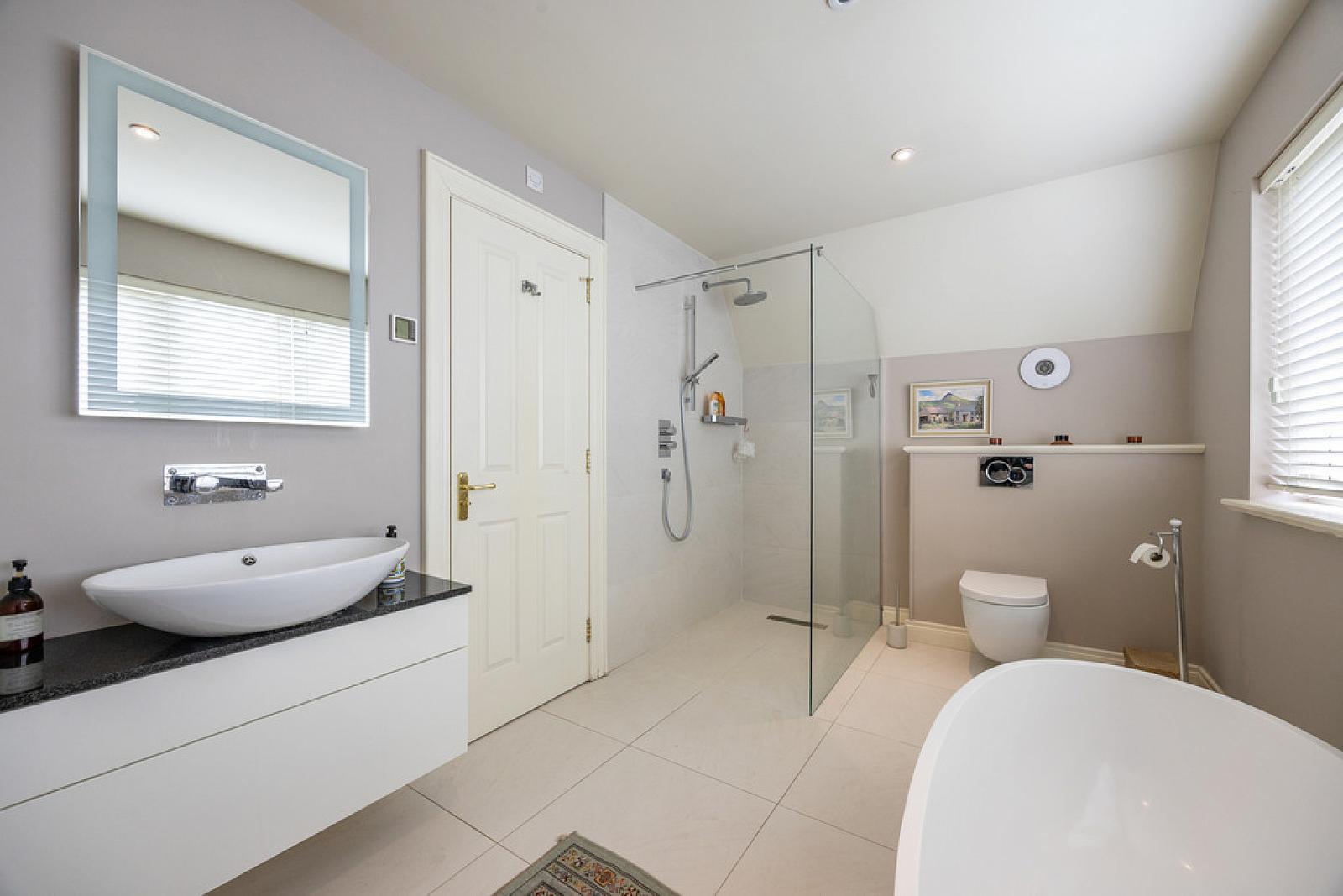 DELUXE ENSUITE BATHROOM Contemporary, white, four piece suite comprising freestanding bath, separate oversized shower enclosure, floating vanity unit and concealed cistern WC. Thermostat controlled mains shower unit with drench shower head. Illuminated mirror over sink. Chrome towel radiators. Part tiling to walls. Tiled floor. Underfloor heating.