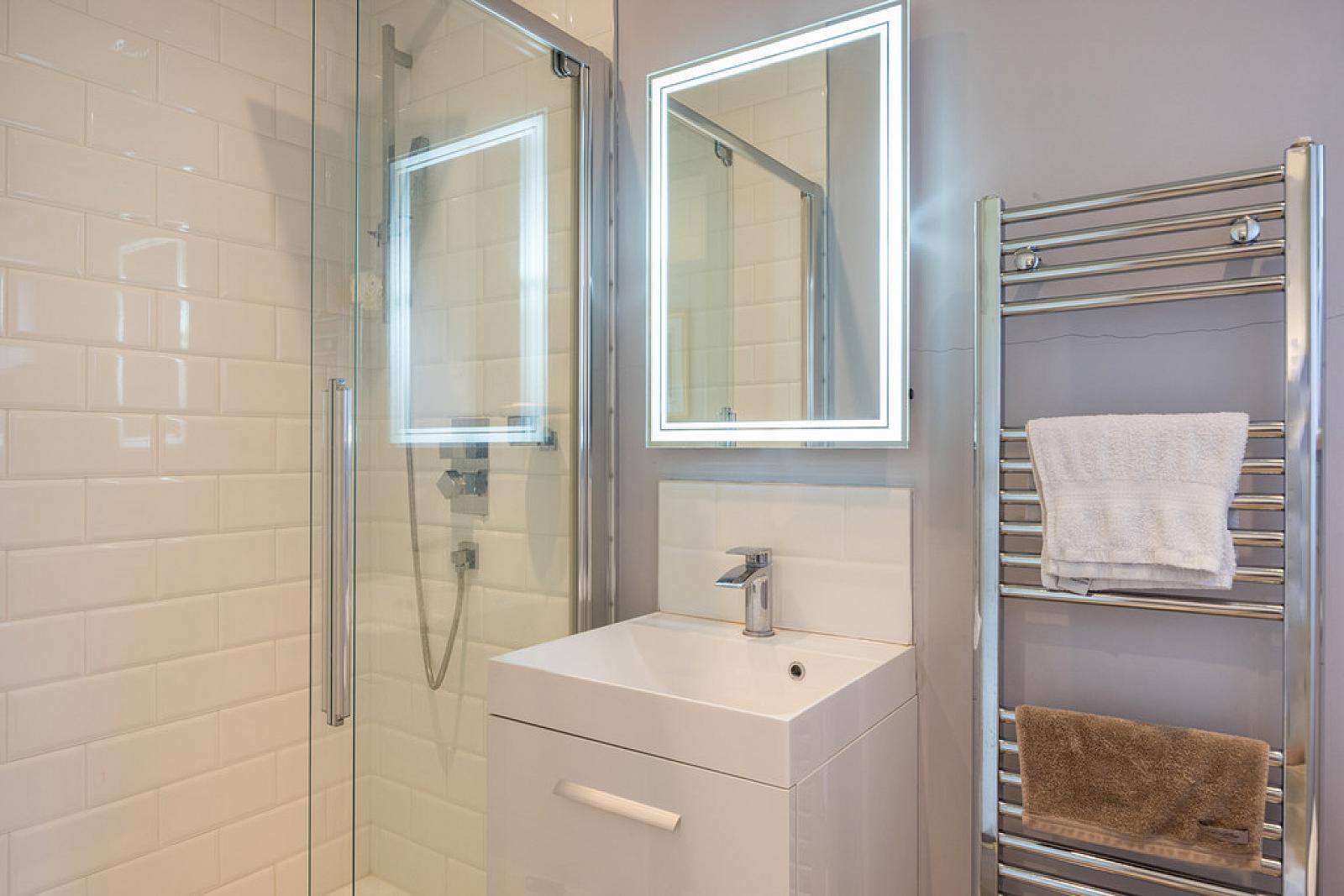 DELUXE ENSUITE SHOWER ROOM Contemporary, white, three piece suite comprising fully tiled shower enclosure, floating vanity unit and concealed cistern WC. Thermostat controlled mains shower unit with drench shower head. Illuminated mirror and splashback tiling over sink. Chrome towel radiator. Tiled floor.