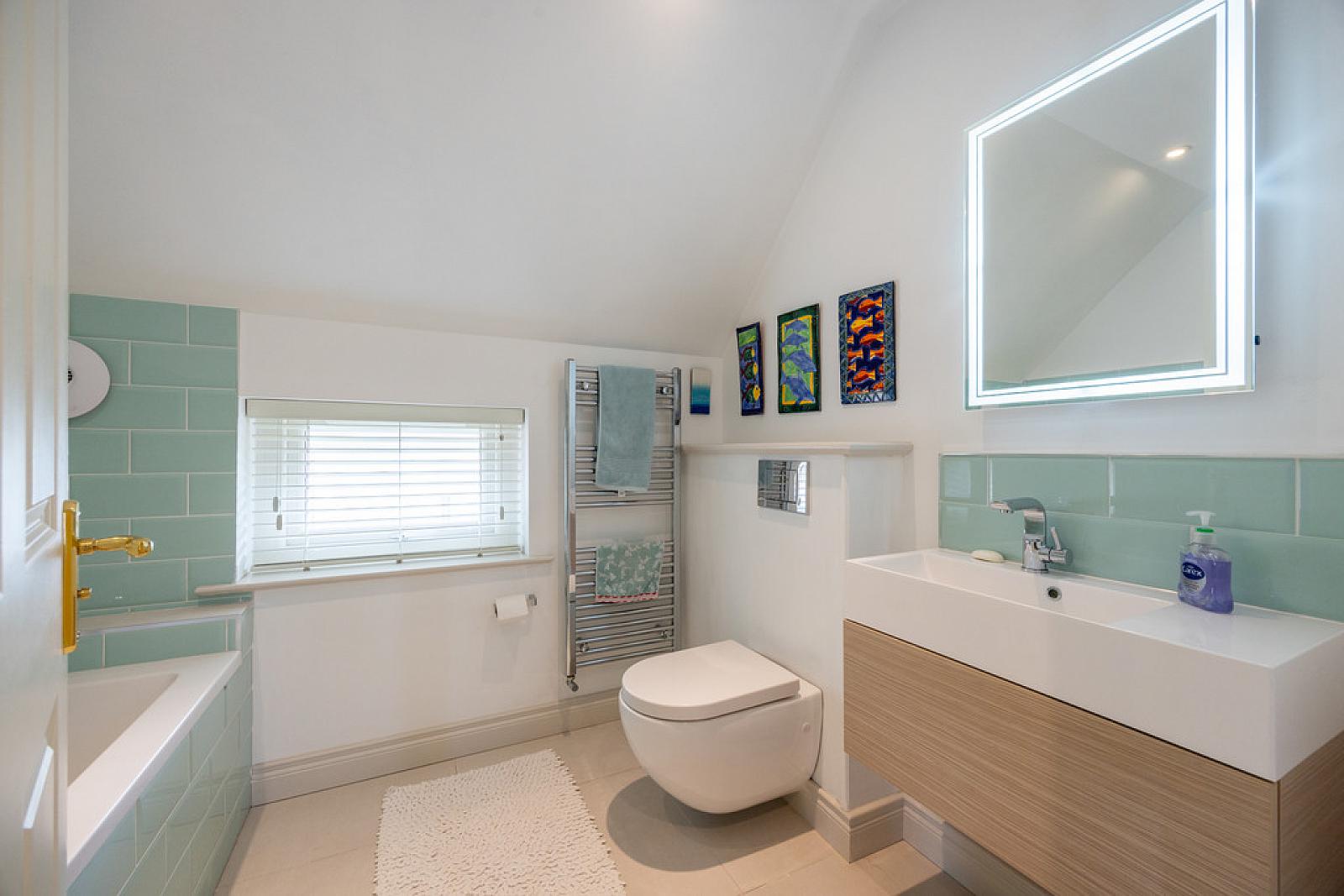 DELUXE FAMILY BATHROOM Contemporary, white, three piece suite comprising tile encased bath, floating vanity unit and concealed cistern WC. Splashback tiling to walls. Illuminated mirror over sink. Chrome towel radiator. Tiled floor.