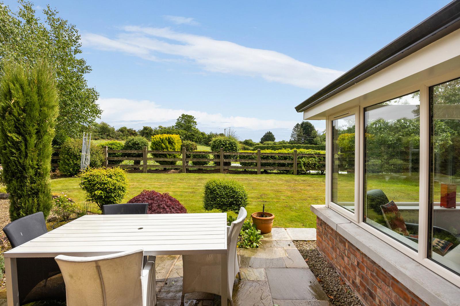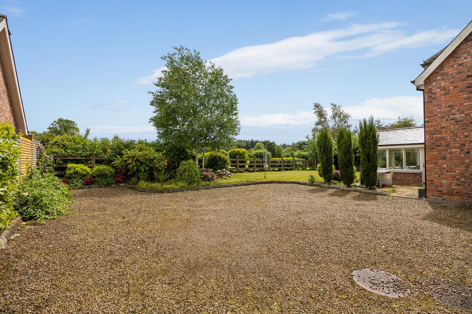 Externally, electric Iroco hardwood gates open onto a generous decorative stone driveway with ample parking, together with an integral double garage featuring tiled floor, utility area, and electric door. Planning permission (renewable) has been granted for an additional garage. Landscaped gardens to front and rear are laid in lawn with patio areas and mature planting, complemented by an irrigation system, exterior taps, and power points. The property is located approximately 0.6 miles from Downshire School and benefits from pedestrian access to Carnreagh Road.