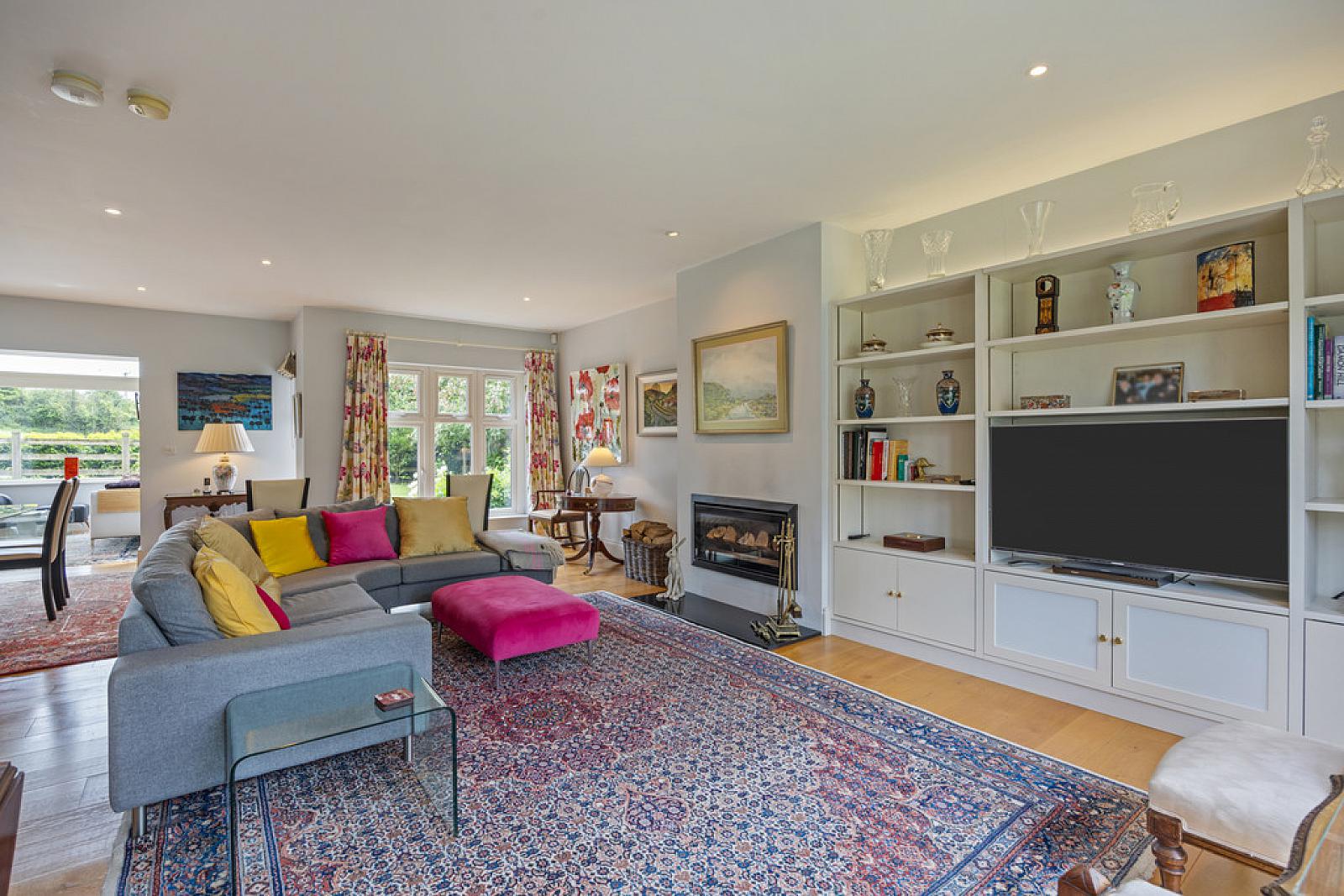 Electric gates open to a generous, private driveway finished in decorative stone, providing ample off street parking. To the rear, the garden is primarily laid to lawn with a paved patio area, ideal for outdoor dining and is further enhanced by an attractive selection of plants, trees, and shrubbery. The rear garden enjoys a pleasant open aspect, offering a sense of space and privacy.