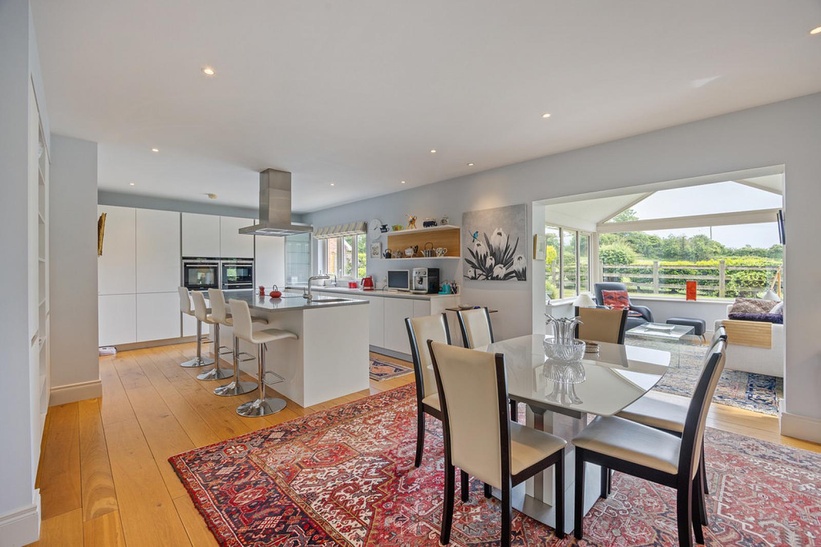 KITCHEN / DINING AREA 25' 4" x 14' 4" (7.74m x 4.37m) Luxury fitted, Interior 360 kitchen with range of high and low level storage units with contrasting, solid quartz work surface. Matching island unit with breakfast bar area and contrasting solid quartz worktop. Inlaid stainless steel sink unit. Secondary preparation sink with Insinkerator waste disposal unit. Integrated, Siemens, touch screen induction hob, pyrolytic/self cleaning oven, pyrolytic/self cleaning combi microwave oven. and warming drawer. Integrated dishwasher, fridge and freezer. Solid quartz upstands to walls and sill. Solid French oak flooring.