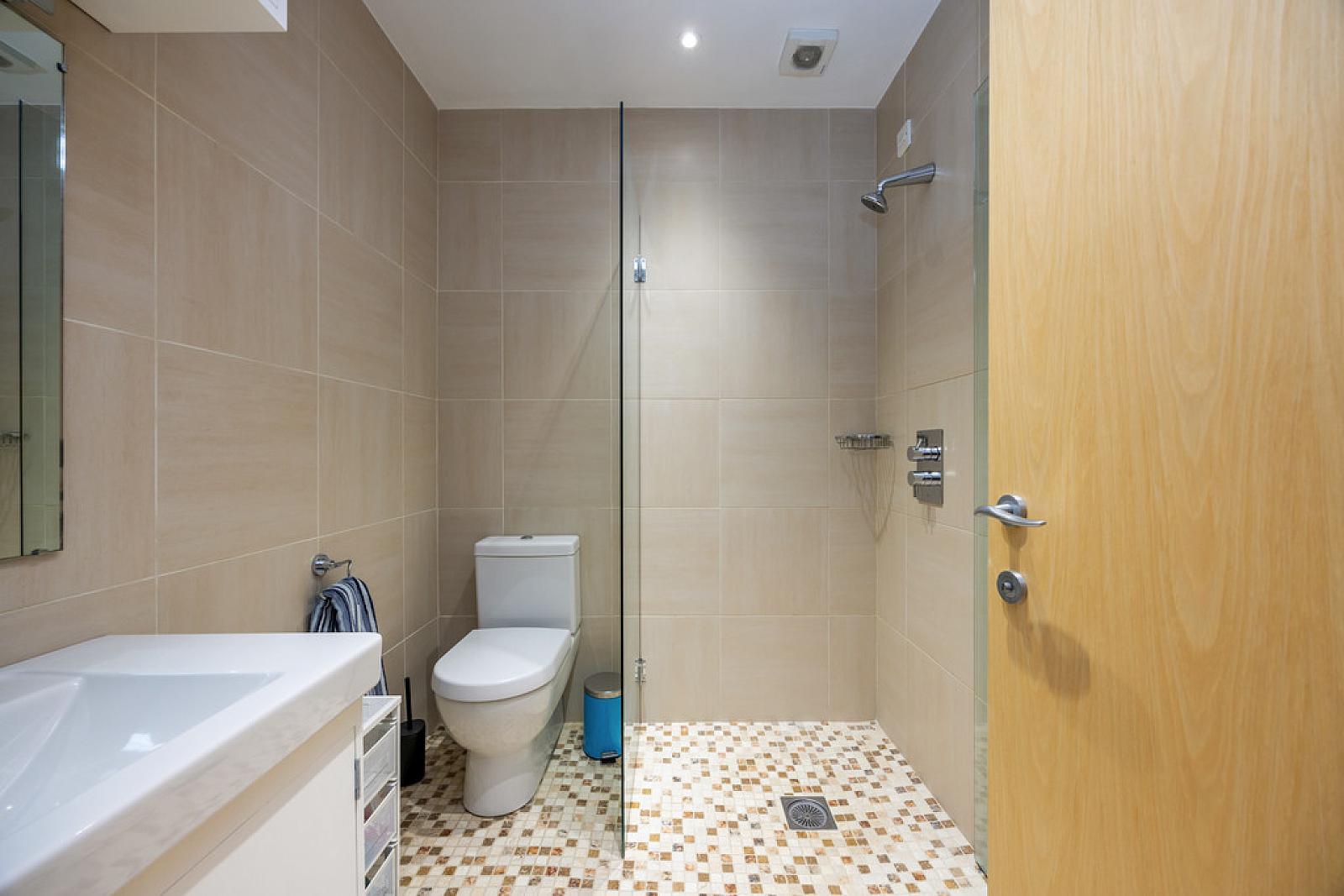 ENSUITE Modern suite comprising walk in shower cubicle, low flush WC, vanity wash hand basin, built in storage/shelving, tiled floor, tiled walls, recessed low voltage spotlights, extractor fan.
