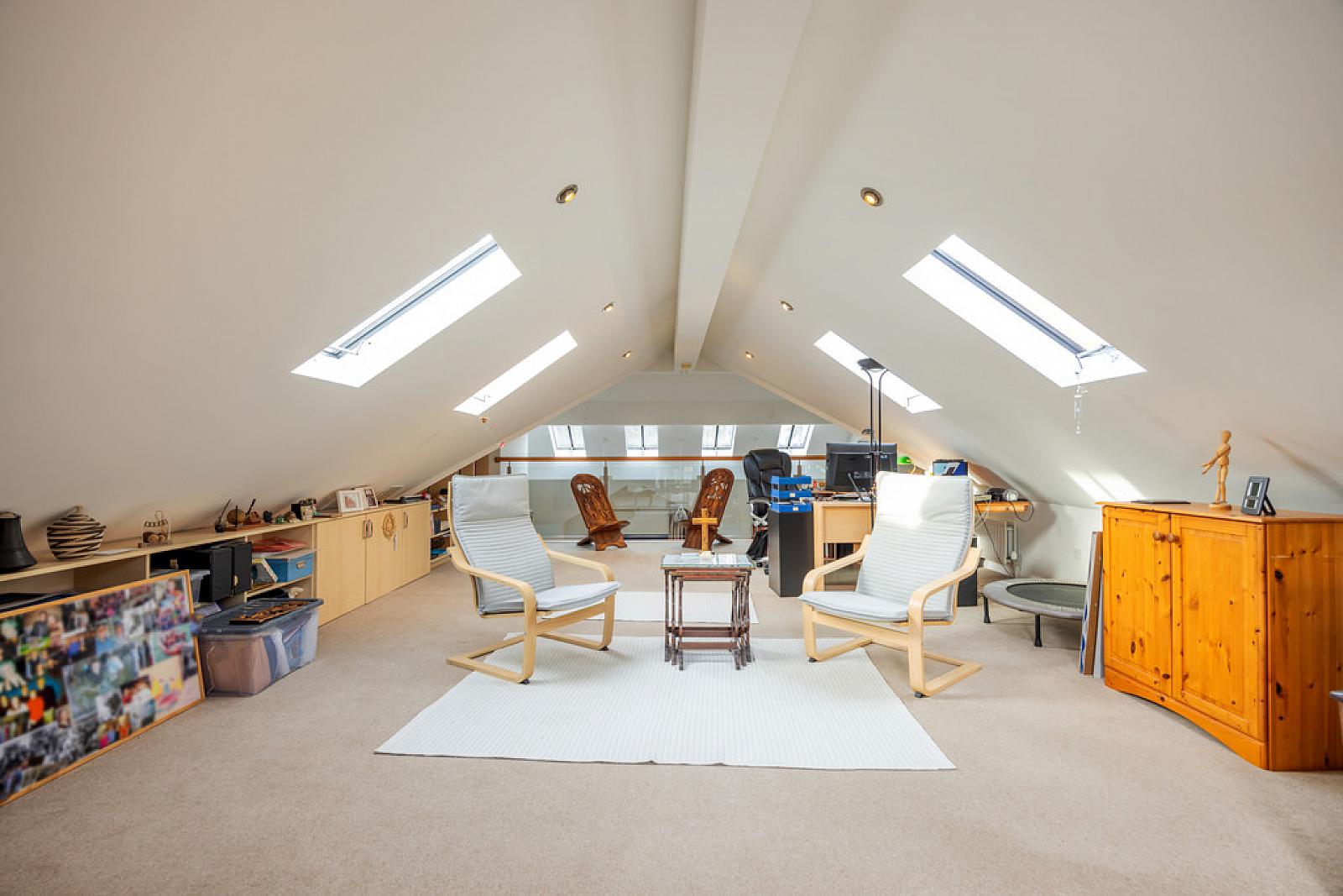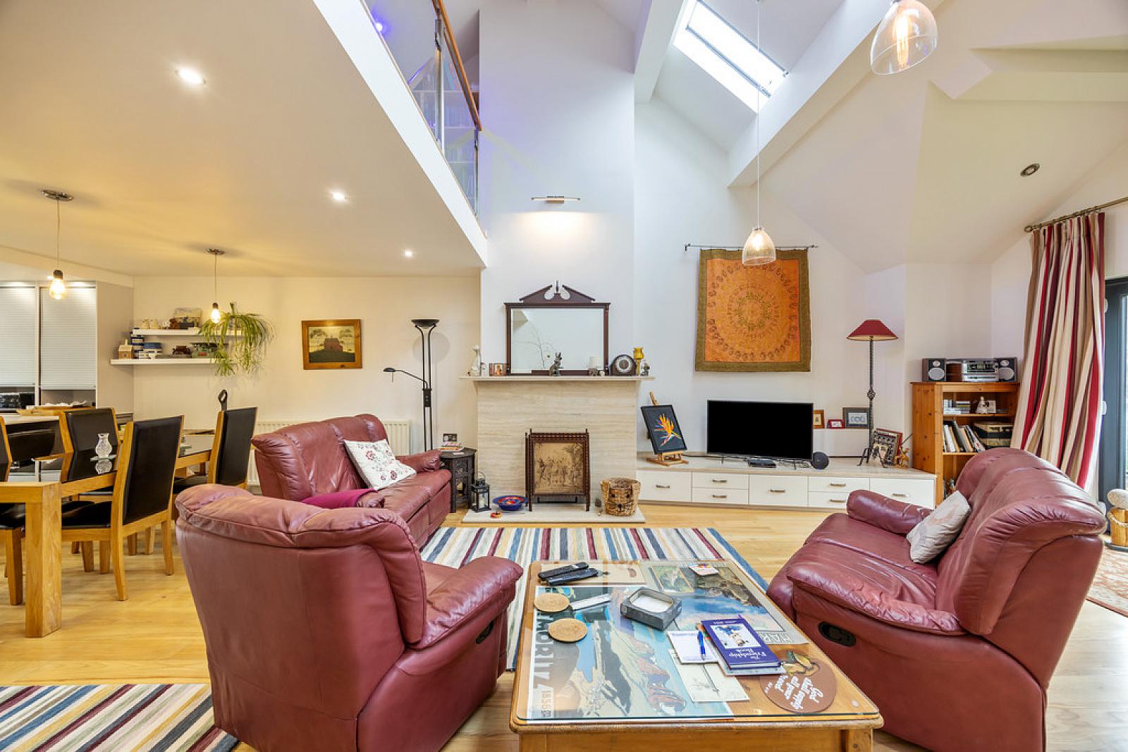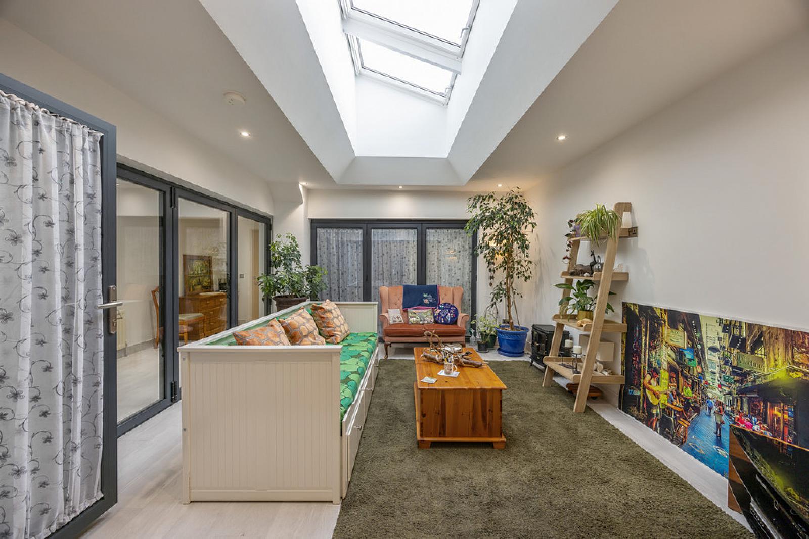 SITTING ROOM 13' 11" x 12' 11" (4.24m x 3.94m) Tiled floor with electric underfloor heating, vaulted ceiling with 3x Velux Skylights.