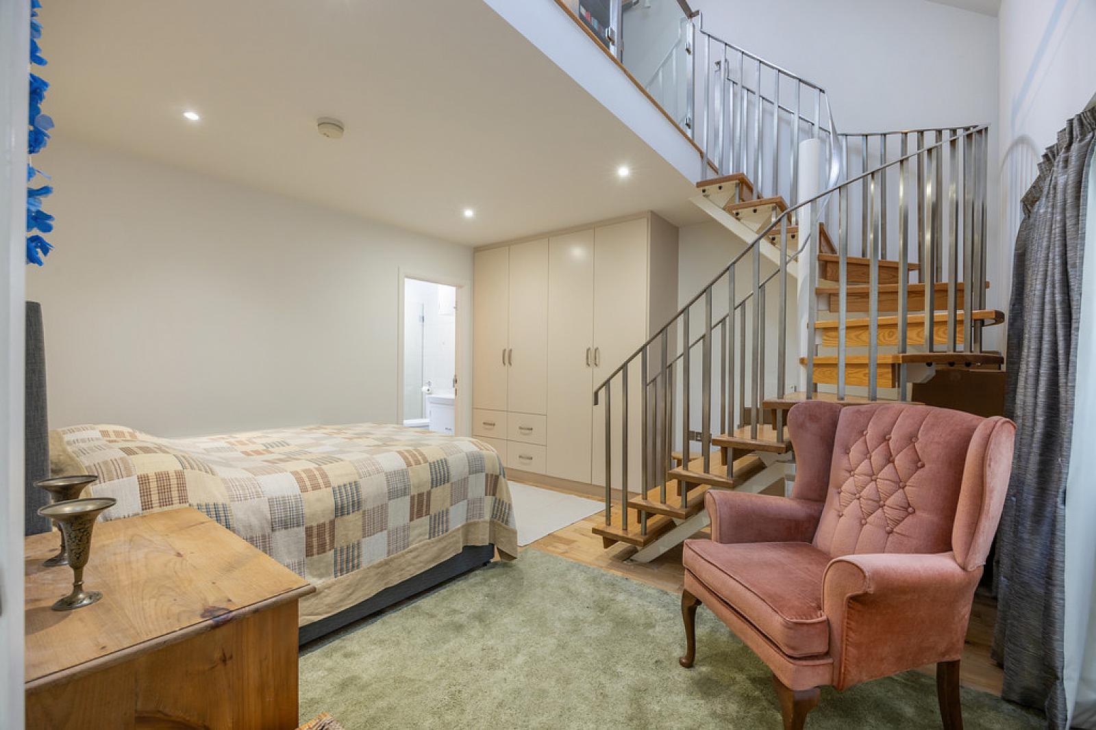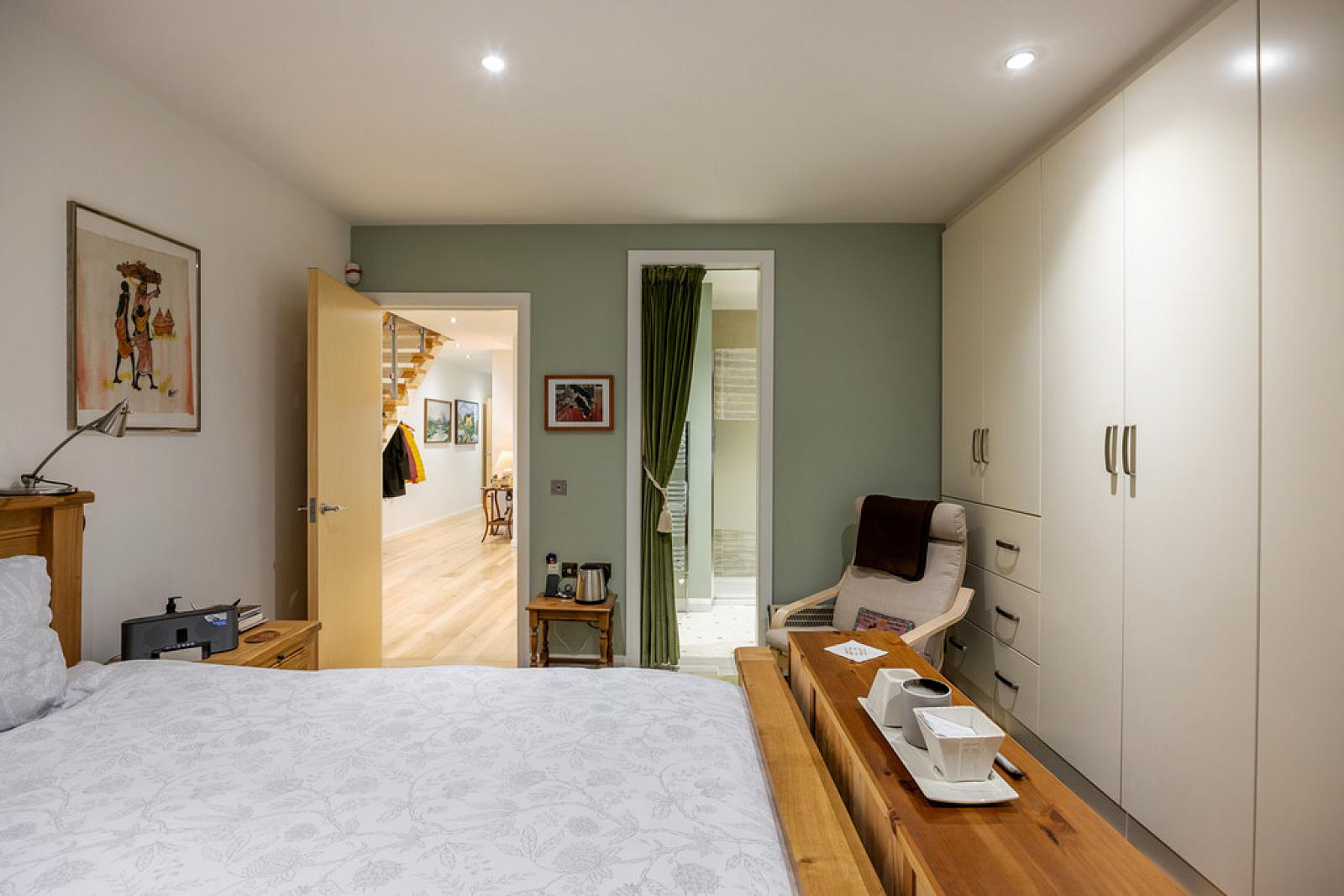 BEDROOM 14' 3" x 13' 9" (4.34m x 4.19m) Built in wardrobes, recessed low voltage spotlights, solid ash flooring, access to Sitting Room, spiral staircase to Mezzanine level Bedroom/Study.