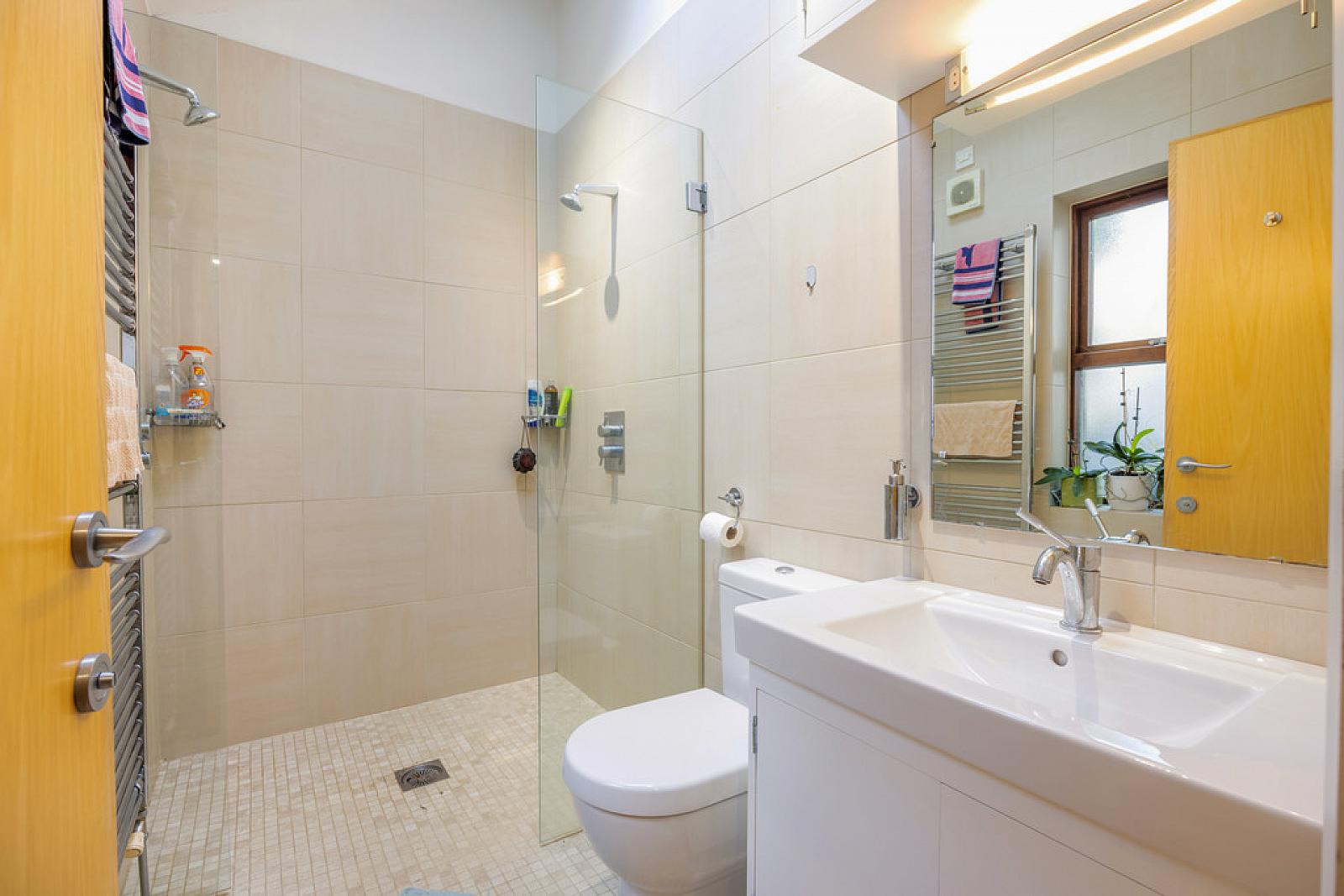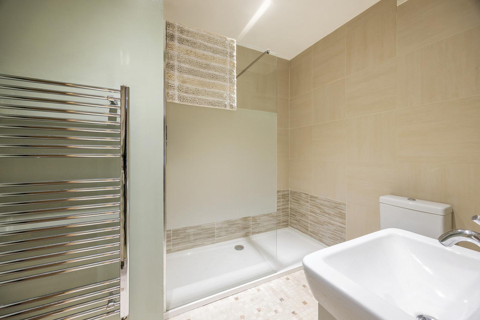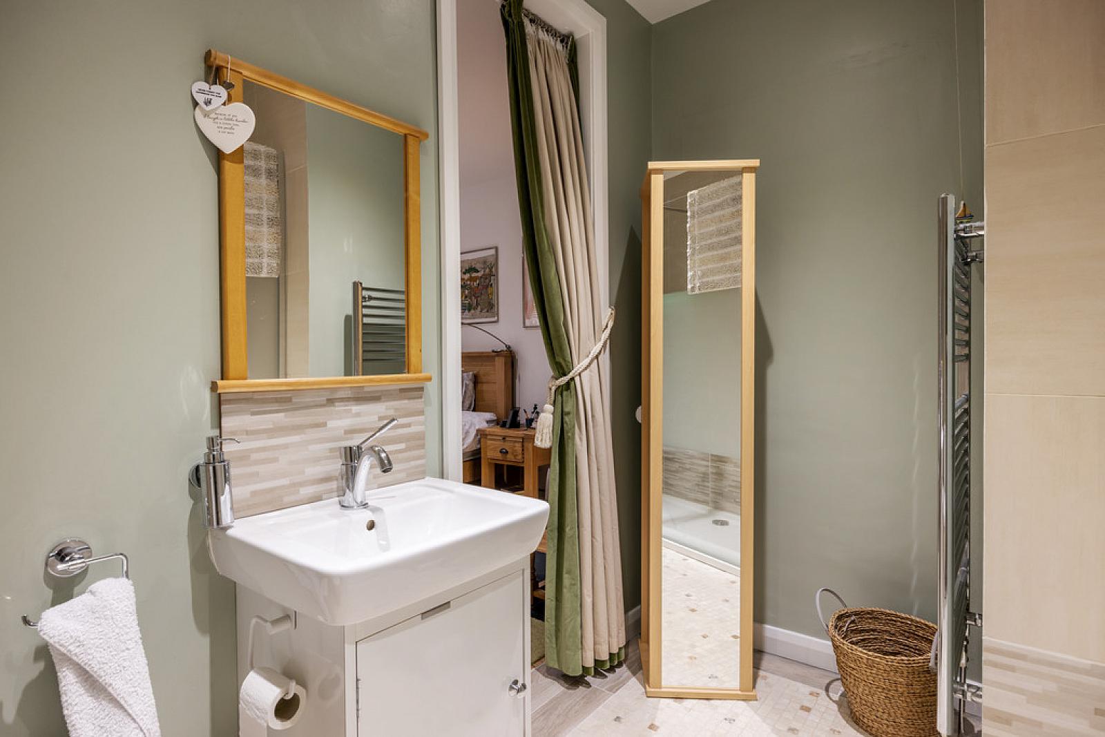 ENSUITE White suite with Villeroy and Boch sanitaryware comprising of walk in shower, low flush WC, vanity wash hand basin, stainless steel towel radiator, tiled floor, part tiled walls