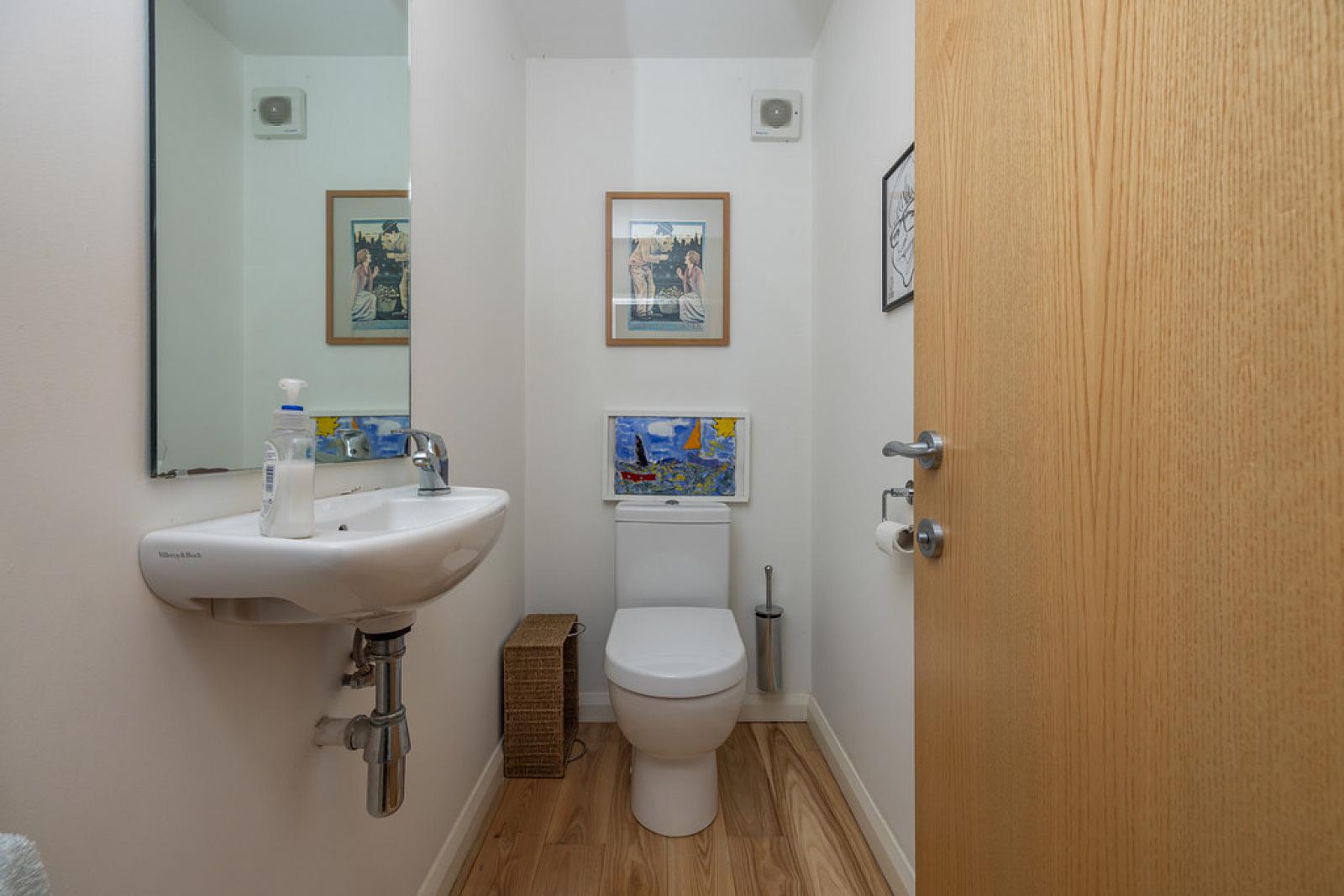 CLOAKROOM/WC White suite comprising of low flush WC, Villeroy and Boch wall mounted wash hand basin, extractor fan, solid Ash hardwood flooring.