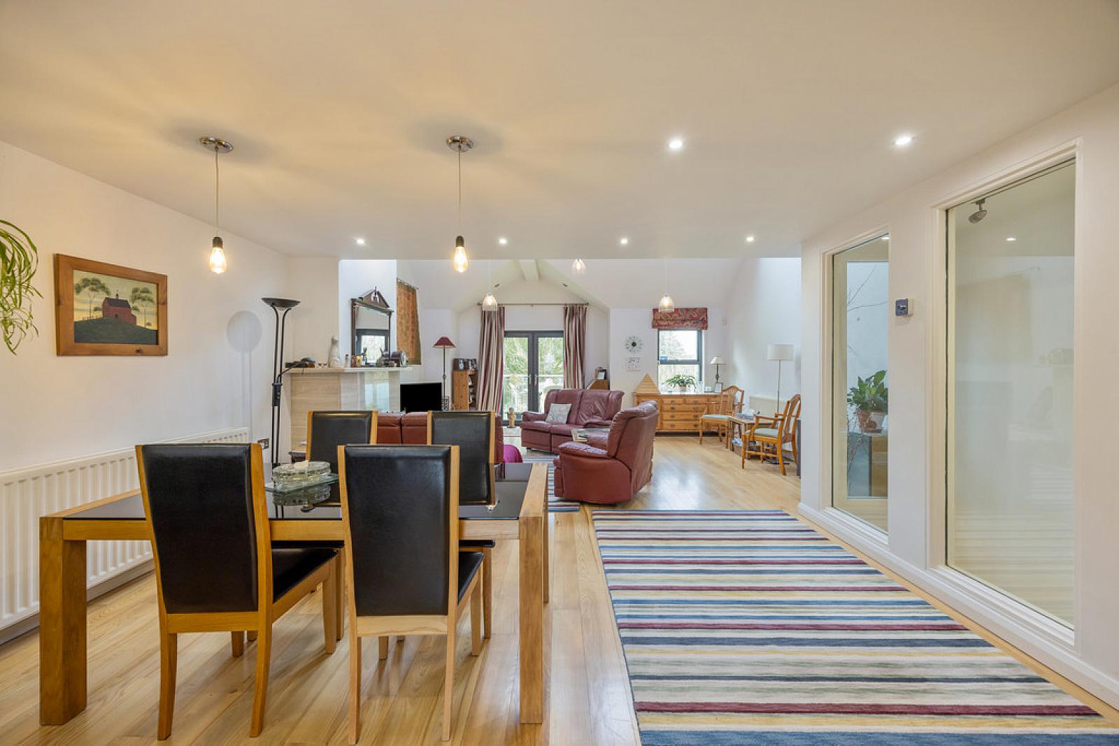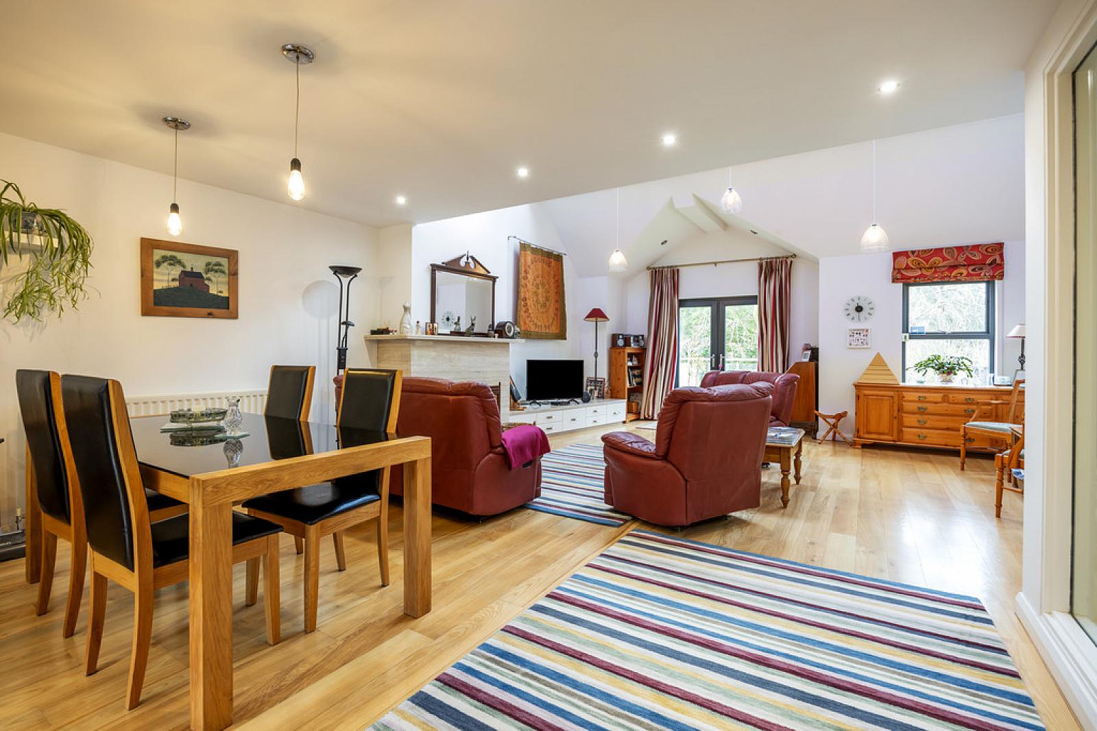 OPEN PLAN LIVING / KITCHEN / DINING 44' 0" x 18' 10" (13.41m x 5.74m) Solid Ash hardwood flooring, feature fireplace with wood burning stove and contemporary limestone surround and hearth, recessed low voltage spotlights, patio doors to large feature balcony overlooking Hillsborough Castle lake and grounds.