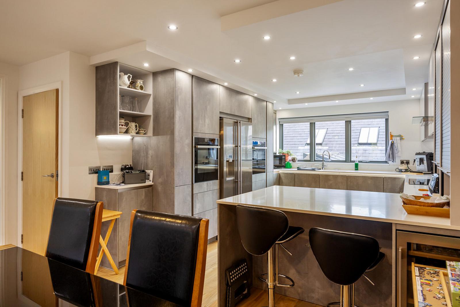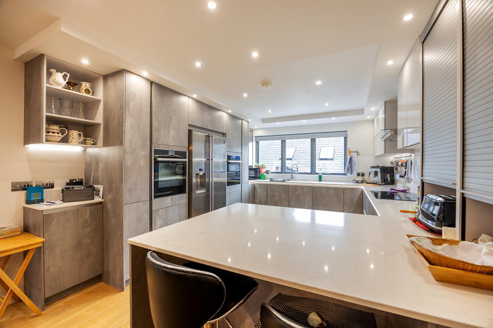 Kitchen area with range of German modern fitted high and low level units, Samsung Radianz worksurfaces with matching upstand, stainless steel extractor canopy, twin sink unit with Quooker tap, American style fridge/freezer, integrated Neff steam oven, integrated Neff oven, feature 'hidden' storage cupboards, integrated Miele dishwasher, integrated Neff 5 ring induction hob, wine fridge, breakfast bar, recessed low voltage spotlights.