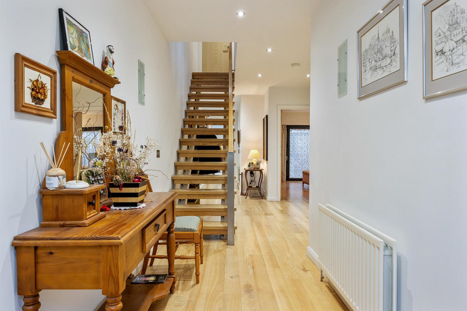 RECEPTION HALL Solid Ash hardwood flooring with mat well, recessed low voltage spotlights, cloakroom/storage cupboards, hotpress with hot water storage tank, stairs to first floor.