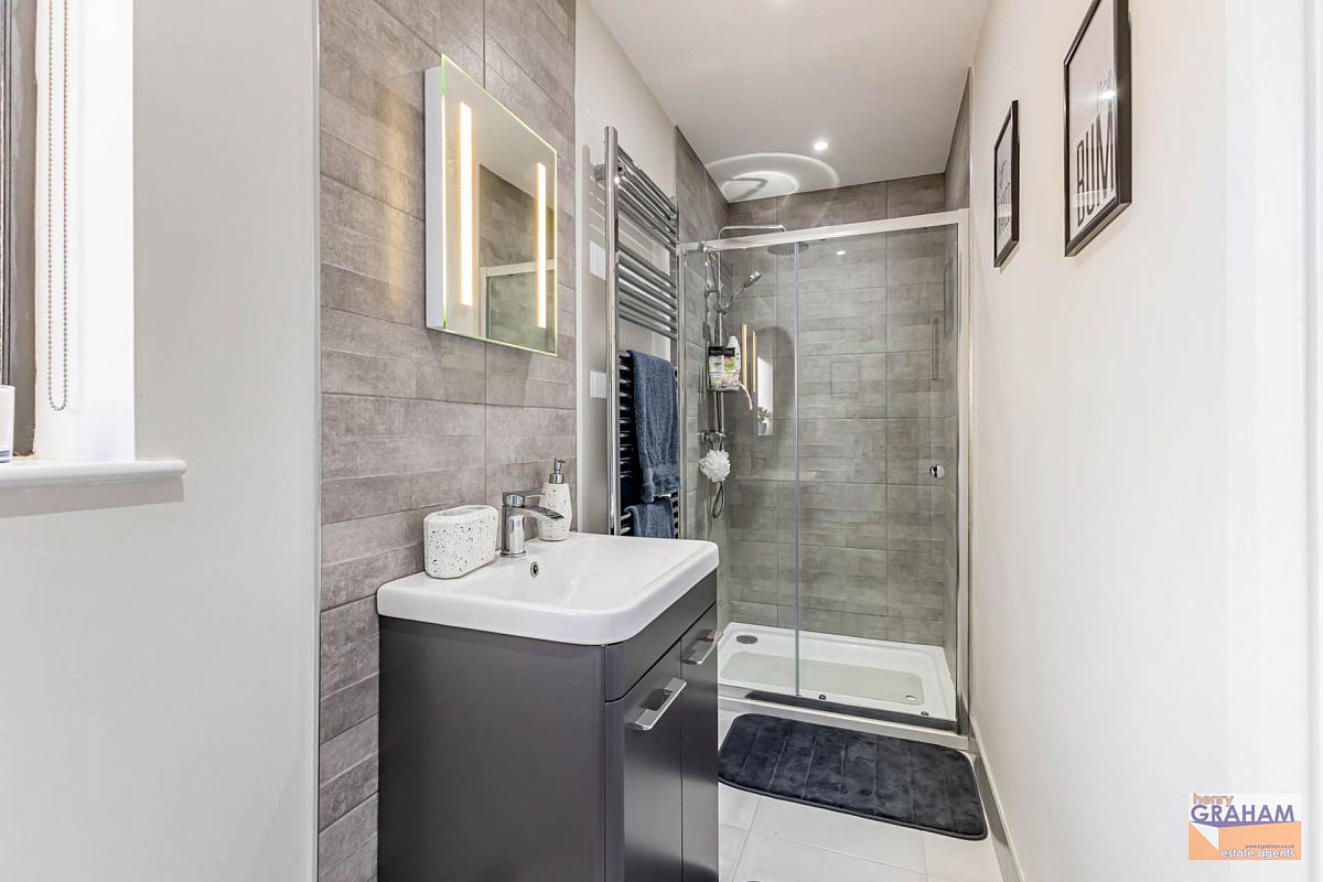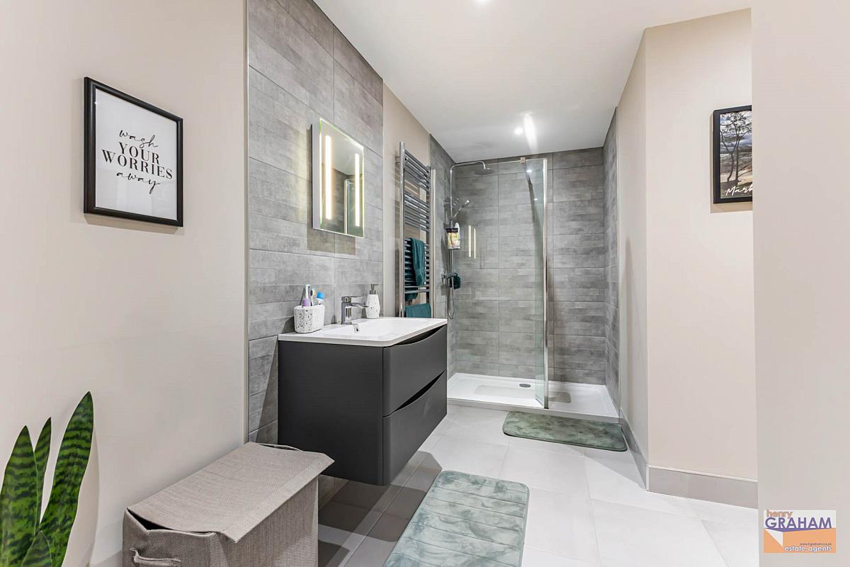 Large shower enclosure with thermostatic shower and drencher head. Wall mounted vanity unit with wash hand basin and mono style mixer tap. Close couple low flush wc. Chrome finish heated towel rail. Recessed spotlights. Part tiled walls. Tiled floor.