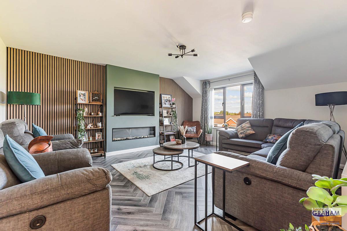 Lounge With Glass Fronted Log And Flame Effect Electric Fire Plus Herringbone Style Laminated Timber Floor