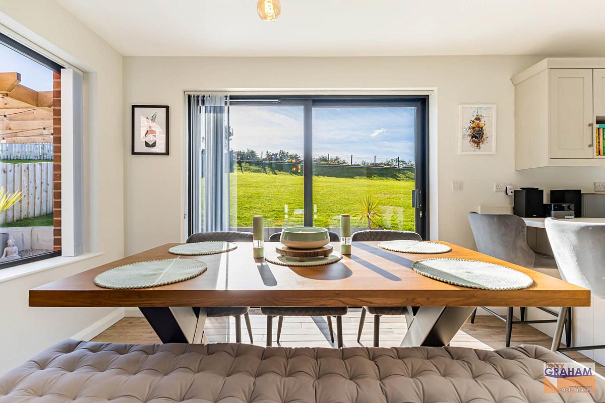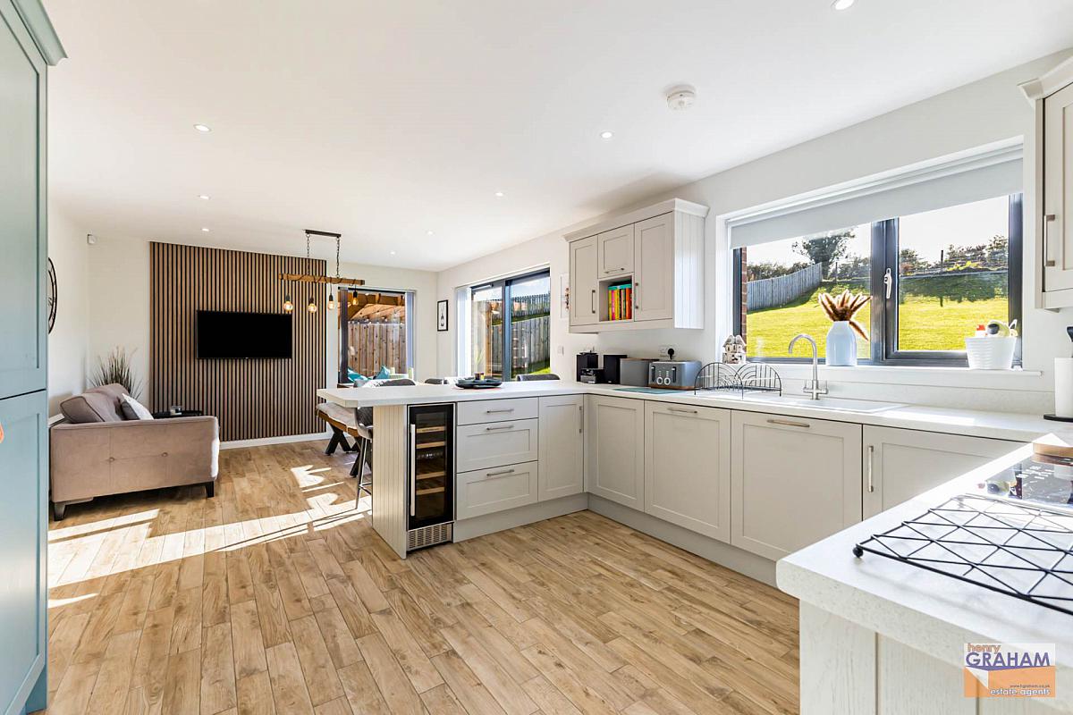 Excellent range of high and low level units. Granite effect round edge work surfaces. Granite effect upstands. Integrated Nordmende four ring induction hob. Integrated Nordmende oven. Integrated Nordmende convection oven and microwave. Integrated Nordmende warming drawer. Integrated Nordmende half and half fridge/freezer. Integrated Nordmende dishwasher. Integrated Nordmende wine cooler. Extractor unit in stainless steel canopy. Tiled splashback. Bowl and a half single drainer composite sink unit with Franke swan neck mixer tap. Dining bar. Recessed spotlights. Wood effect tiled floor. Double glazed sliding patio doors to rear patio area and garden.