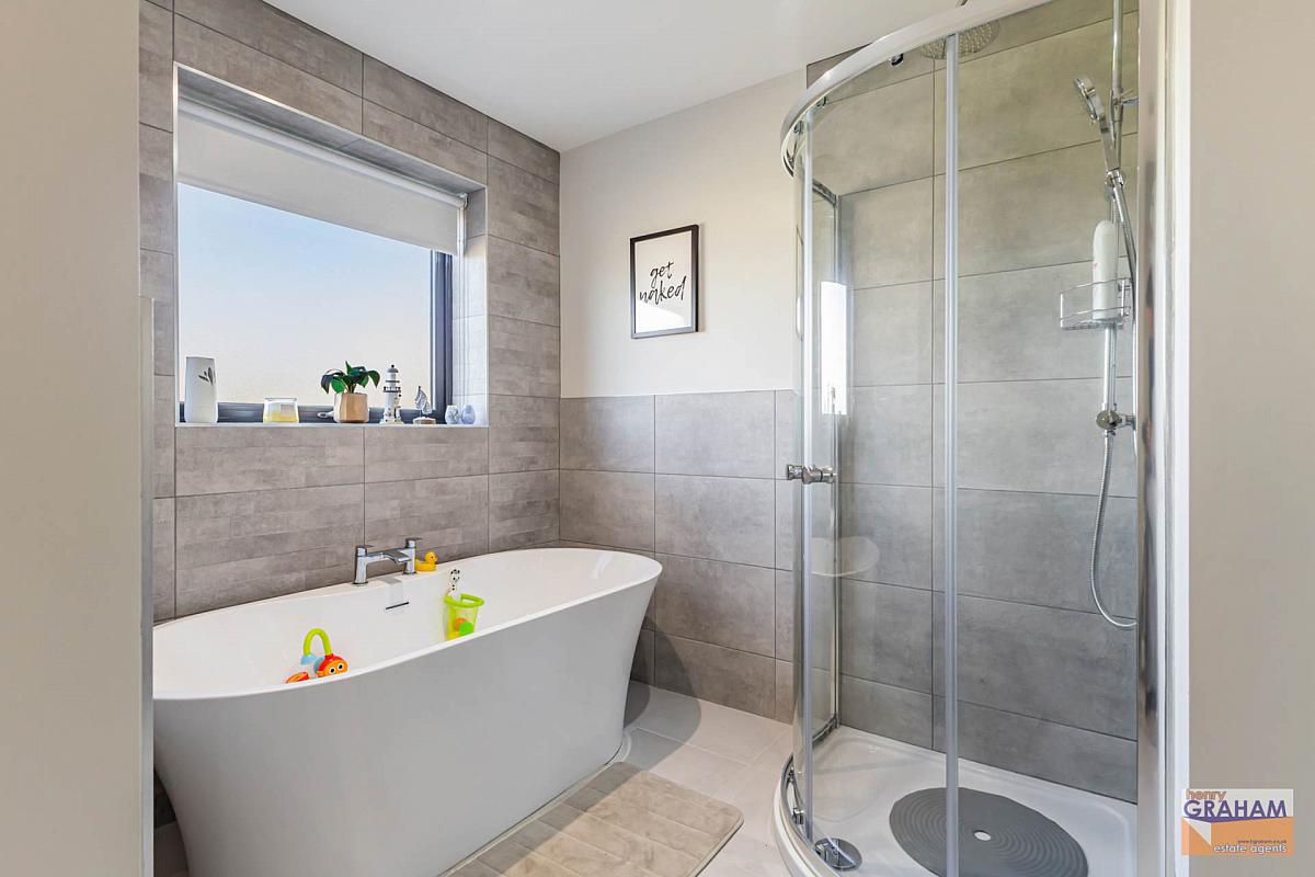 White suite. Quadrant shower cubicle with thermostatic shower and drencher head. Freestanding bath tub with centre mount mixer tap. Wall mounted vanity unit with wash hand basin and mono style mixer tap. Close couple low flush wc. Chrome finish heated towel rail. Recessed spotlights. Part tiled walls. Tiled floor. Separate storage cupboard on landing.