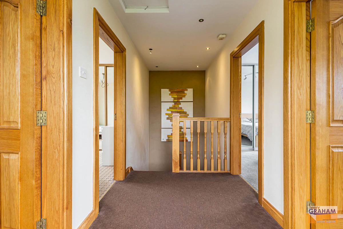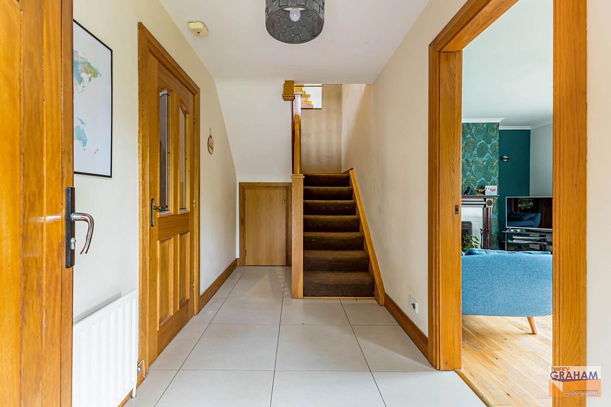 Porcelain tiled floor. Hardwood entrance door and double glazed side panel. Storage under stairs.