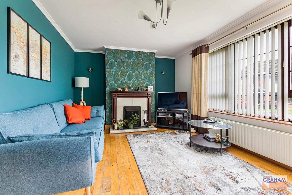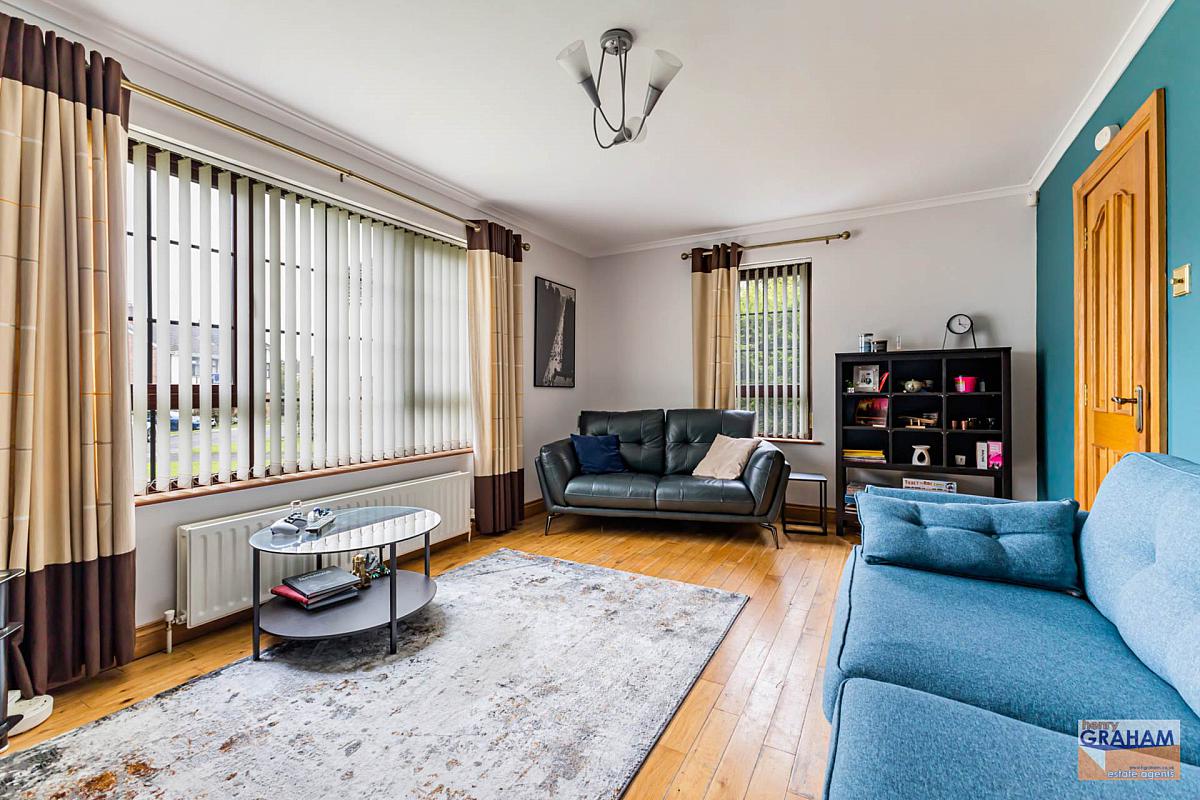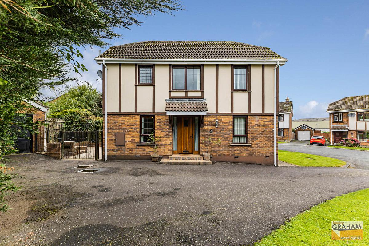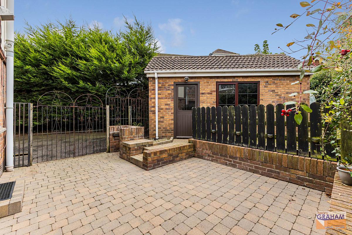 Prime end of cul-de-sac setting. Front and side gardens laid in lawns. Asphalt driveway and parking space. Tobermore brickset patio area to rear. PVC oil storage tank. Outside tap and light.