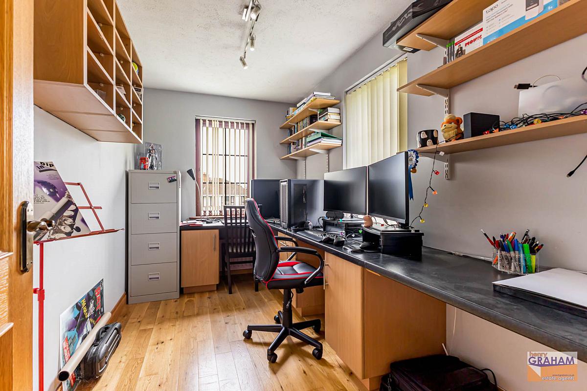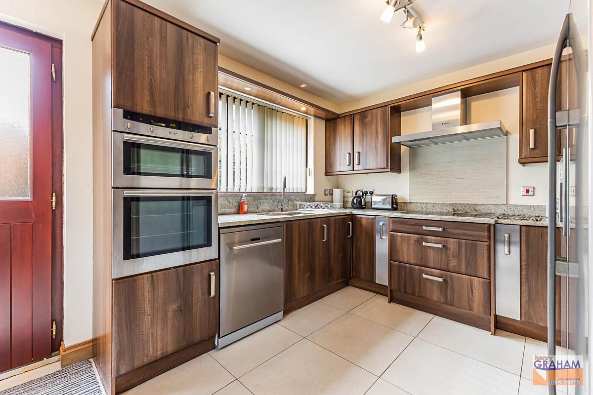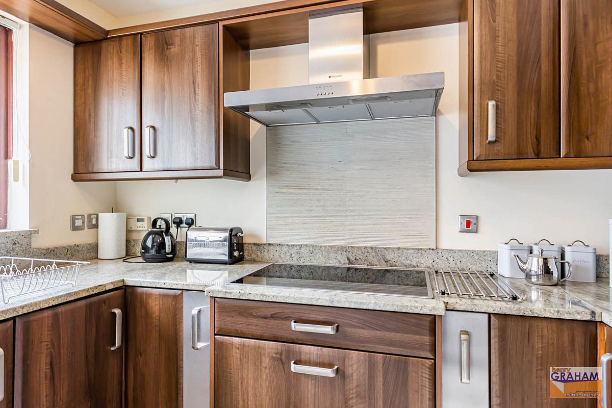 Excellent range of high and low level units. Granite worktops and upstands. Bowl and a half stainless steel sink unit with mixer tap. Integrated double oven and Neff touch control ceramic hob. Hotpoint extractor hood in stainless steel canopy above. Porcelain tiled floor. Plumbed for dishwasher. Space for American style fridge freezer.